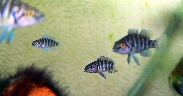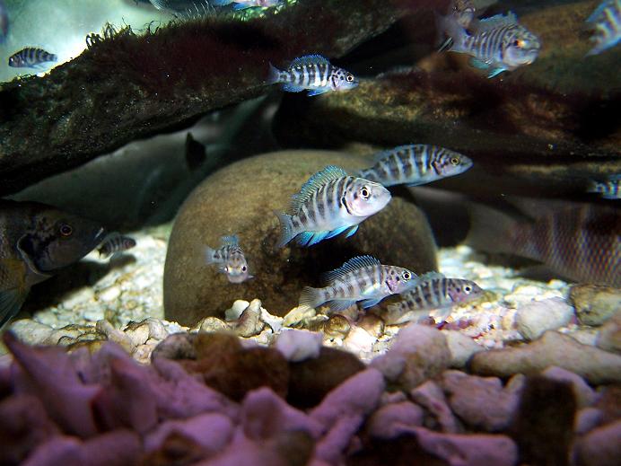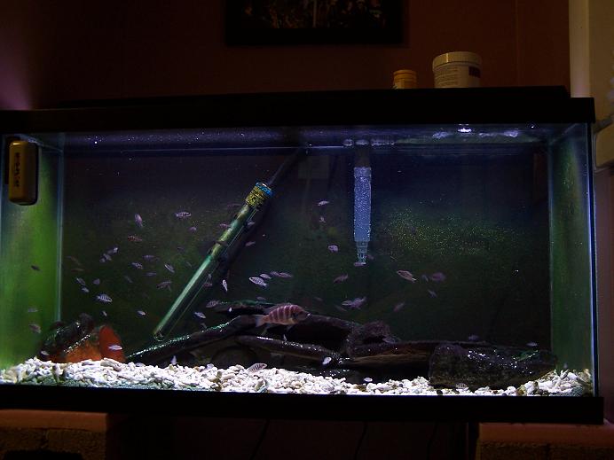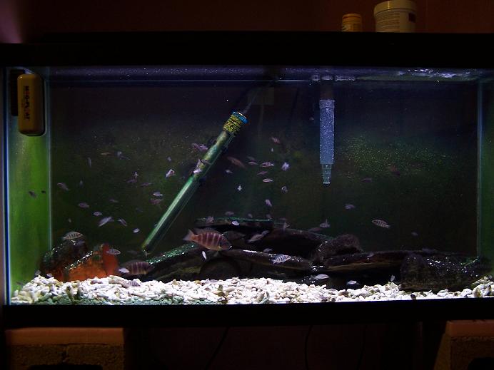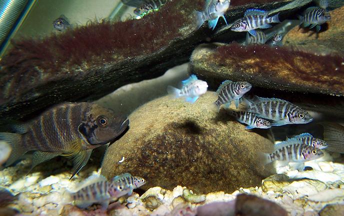 So as it turns out, not all Neo's are as stupid as brichardi.....spawning and spawning until they choke themselves out of tank...I have had these guys since I think february and they have only had 4 spawns, all within a week of each other or so...they have not spawned since around march, which tells me that they are in fact smart enough to know that they have had enough babies for now. Good fishies. Anyway, thought I would share them with you as they are growing up. They are definitely not the best looking fish, but they are certainly rare. I found out around a week ago that I have 4 of 8 wild caught specimens in western Canada, if not all of Canada. There are no distributors in the east that have even heard of them yet...none that we know of anyway....going to try and get them over there sometime soon, through a local distributor. Don't know if they will catch on though...they just aren't as flashy and pretty as most cichlid owners want their fish to be, these guys are all personality. Crazy buggers. The tank is as natural as I can have it be right now...only the 3 parents and the babies...no cleaning crew whatsoever...tried to put a couple plecos in there before...fair sized ones....but the savoryi killed one and almost the other too....meanies. Anyway, what I am trying to say is, don't mind the wallpaper of algae, because the fish don't.