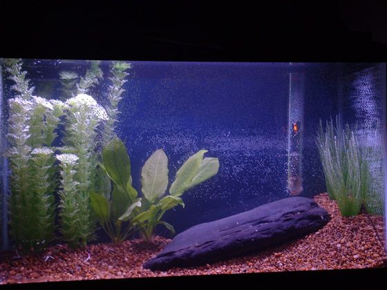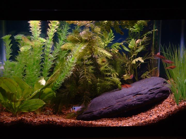Here is a picture of my girlfriends first tank that I got for her. All the plants are fake except for the micro swords. She put 2 Dwarf Neon Rainbows and 4 Harlequin Rasboras in there so far.