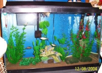 It has a school of 5 giant danois,6 rummynose tetras and a pencilfish who thinks he is a rummy,one white cellophane betta female and 2 angelfish. I used sand this time and it looks so good. No more gravel ever for me!