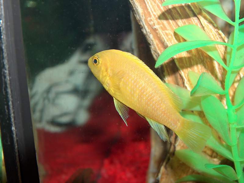 he lives with 1 electric blue johanni, 1 red oscar, 1 sunfish, and 1 pleco. they will be moved after x-mas to a bigger tank. for now they are in a 33 gal.