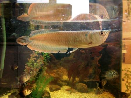 At a rough measurement i'd say the fire eel was around 27 inches from nose to tail and the best part of 3 inches thick, its not fussy about what it eats, i feed a mixture of prawns whitebait and mussel and whatever hits the water and is missed by the silver arowana or p bass the fire eel is there next to hoover it up.