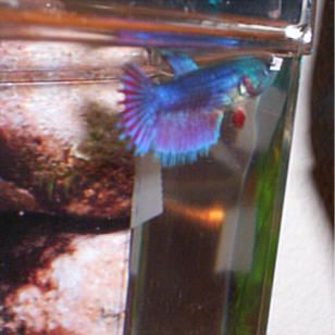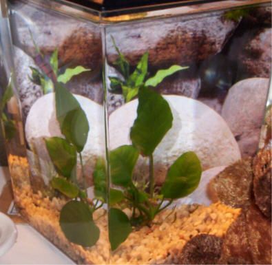 This is the blue gal in her tank.. I just wanted to show y'all how tiny they both are. See her on the left by the leaf? Teeny!! This is one of those one gallon tanks from Walmart.
