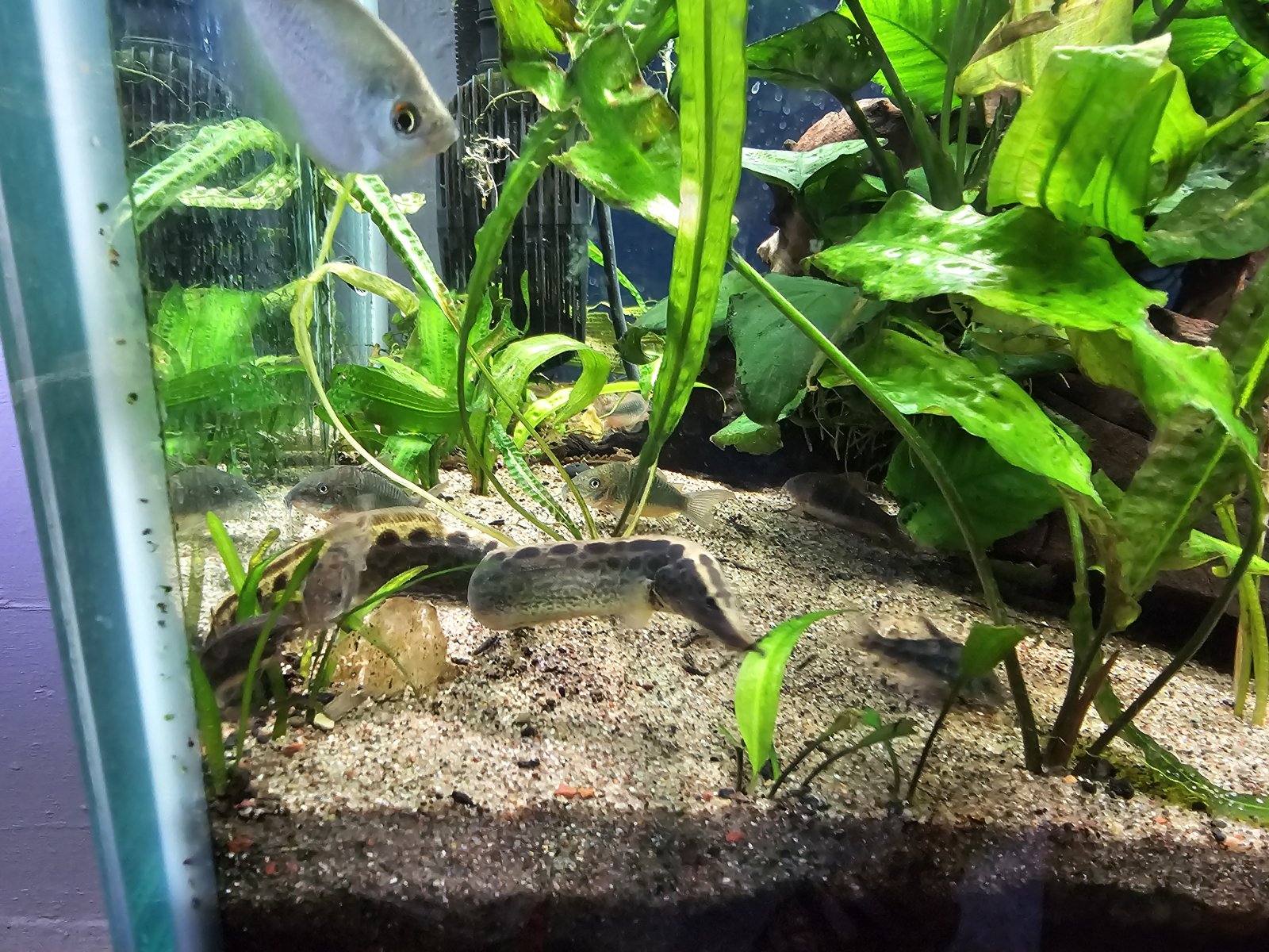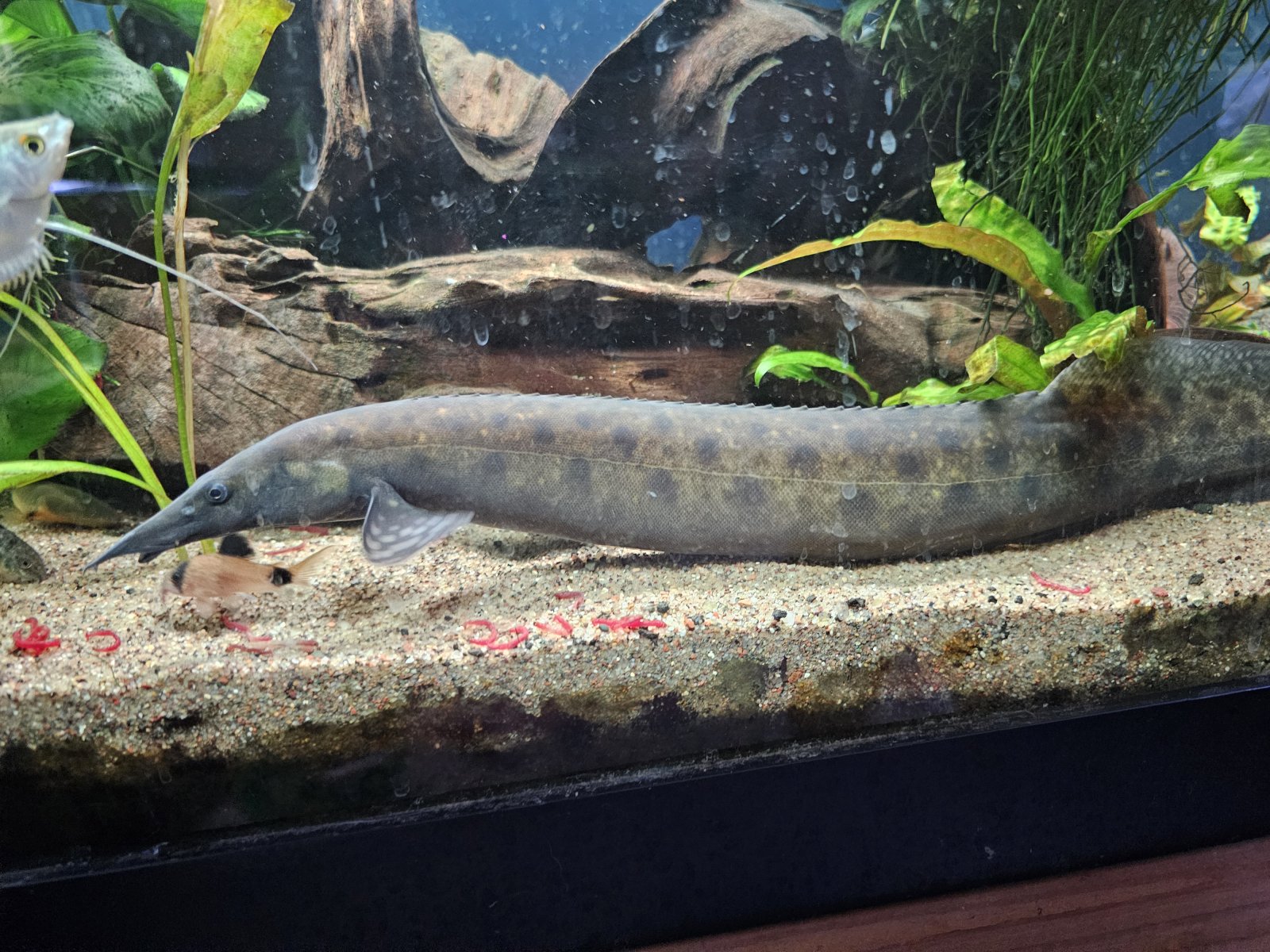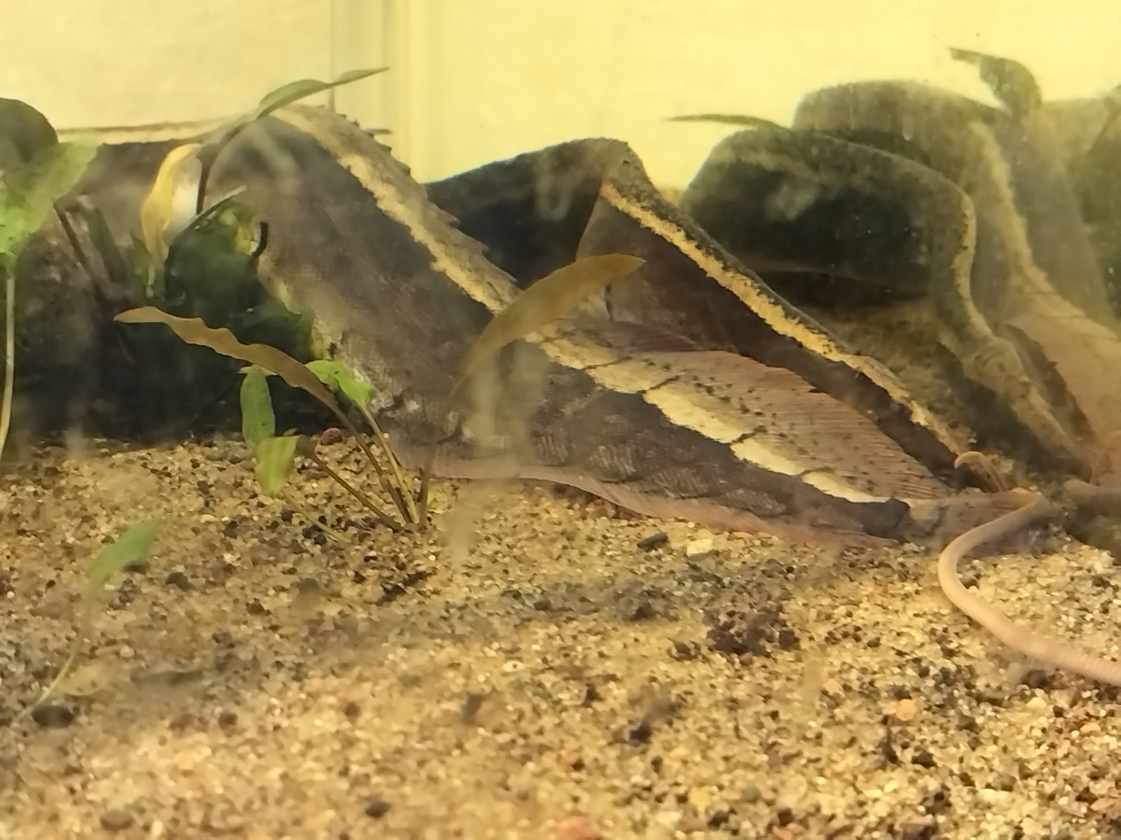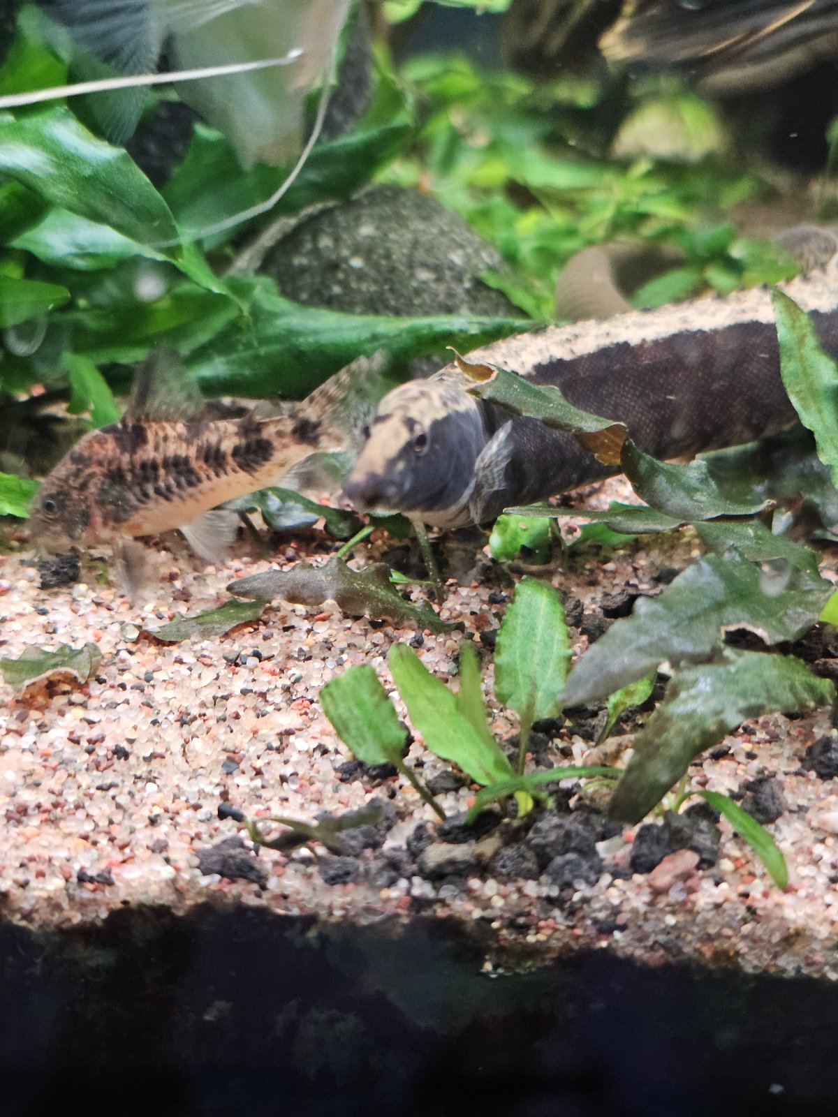 The other big mug is our new tire track eel. We went to a local fish store in Wisconsin and someone had dropped it off full size 6 years old and it eats pellets. She's absolutely gorgeous and it took her all of 2 days to start begging for food from us. When she sees us she comes forward and it's a fight to get her food before the bumblebee Oscars try to eat it.