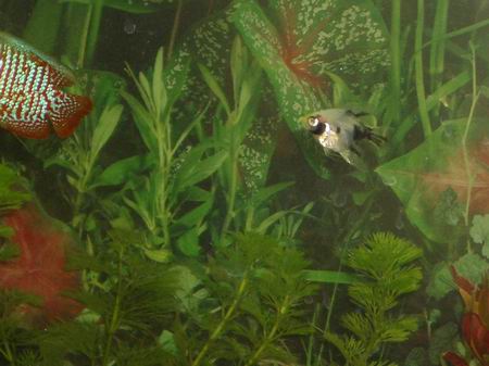 got some new fish today i got 2dwarf gouramis 2 blushed marble angles and guppys also got a back ground for the tank