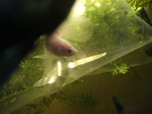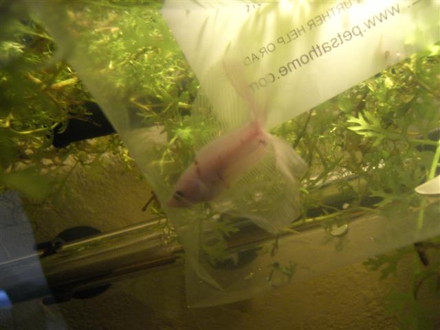 he is floating in a bag in my sorority just now, but will shortly be moved to a freshly set up 35 litre tank all to himself