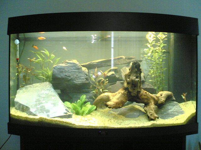 You could put some nice tall plants in the back like vallisneria, and maybe some java moss on the driftwood or rock to soften them up a bit. I'm not too up on plants, but I think those would work in harder water.