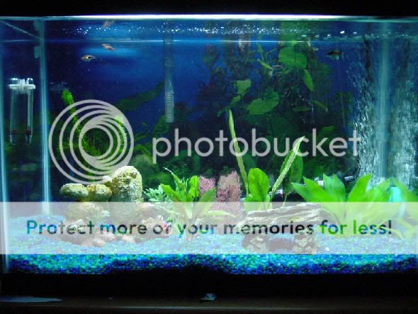 i added some real plants and switched it around, eventually i will get rid of the fake ones (the pink one and the bright green all the way to the right). i also wanna get sand instead of this ugly gravel eventually. i dont think it will happen though, cause i'm giving the tank to my parents when i go to college in 15 days