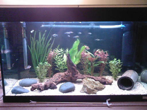 I've been using the forum for a quite a while but I don't post very often as I'm a bit of a wimp! I've finally posted a pic of my new (ish) tank though and would love some feedback. It is a Fluval 125 so I think 27.5 gallons and has 8 black neons, 1 hoplo cat, 2 german rams, 1 kuhli loach and 1 peppermint plec. The water is perfect (Ammonia and nitrite 0) and has been all the way through as I upgraded from my previous tank gradually. I don't know if I could add anything else??? I am thinking maybe a gold nugget plec OR a few dwarf gouramies? I am not that fussed though as I am really enjoying it as it is. I could rehome the hoplo if I felt like it but I am quite attached to "blunder fish" and I think I'd miss him!