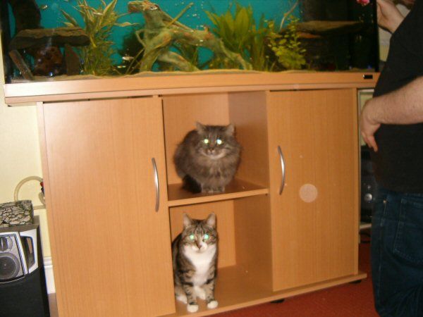 The cats are quite cheeky, now the smaller one has taklen to sleeping on the top of the tank where it's warm, i have images of coming down one morning and finding them both on there and the lid sagging into the water cos the grey one is much heavier.. Oh well always like cat fish!!!