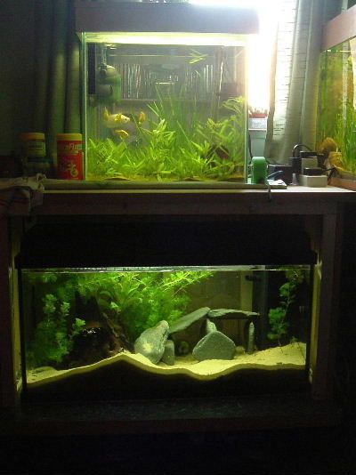 Heres my new tank stand, it has 5inch glass resin wheels each holding 100lbs (45kg), then there are 10 2"x2" support beams on a piece of kichen counter top which hold an 18mm piece of MDF which the smaller tank rest on. Ofcourse it is all supported by brakets and hundreds of screws, the beams are covered and supported by 18mm sheets of MDF to. The top tank is my small Asian containing Golden Barbs, Kissing Gourami (growing out) and Chain Loaches. The bottom tank is the new oddball tank with African Butterfly fish, Flying Fox and a Gibbiceps Plec. The Gibby is being moved though and hopefully it will house Peacock Eels, Mogurnda Mogurnda Gobies, African Butterfly fish and a Flying Fox.