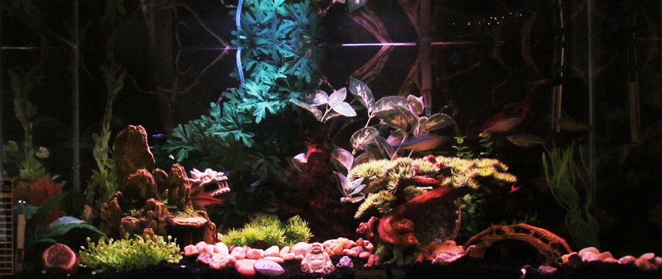 The tank has black gravel and arteficial plants, and has a lot of plant cover at either end and at the back of the tank with open swimming space in the front and center. There are also a couple pieces of driftwood and two caves.