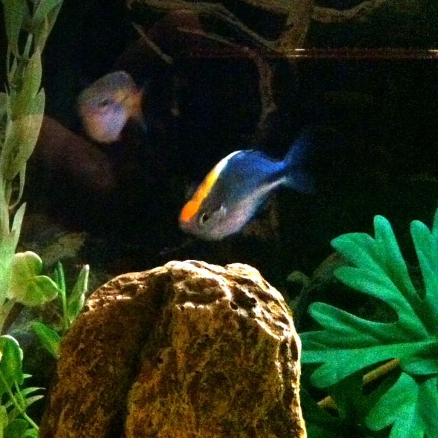 The rainbow fish seem happy enough, but not particularily outgoing. They mostly hide together at one end behind a piece of driftwood with one or two of them occasionally swimming across the tank. They do eat, but not enthusiastically. The male turquoise seems to be after all the ladies in the tank (no matter what species) and can really flash his orange stripe on and off when he wants to, which is pretty awesome! I am concerned because I heard they were very outgoing, enthusiastic fish, and mine seem rather shy and skittish for the most part. Does the bright light in the tank bother them perhaps? Should I get another pair of turquoise?