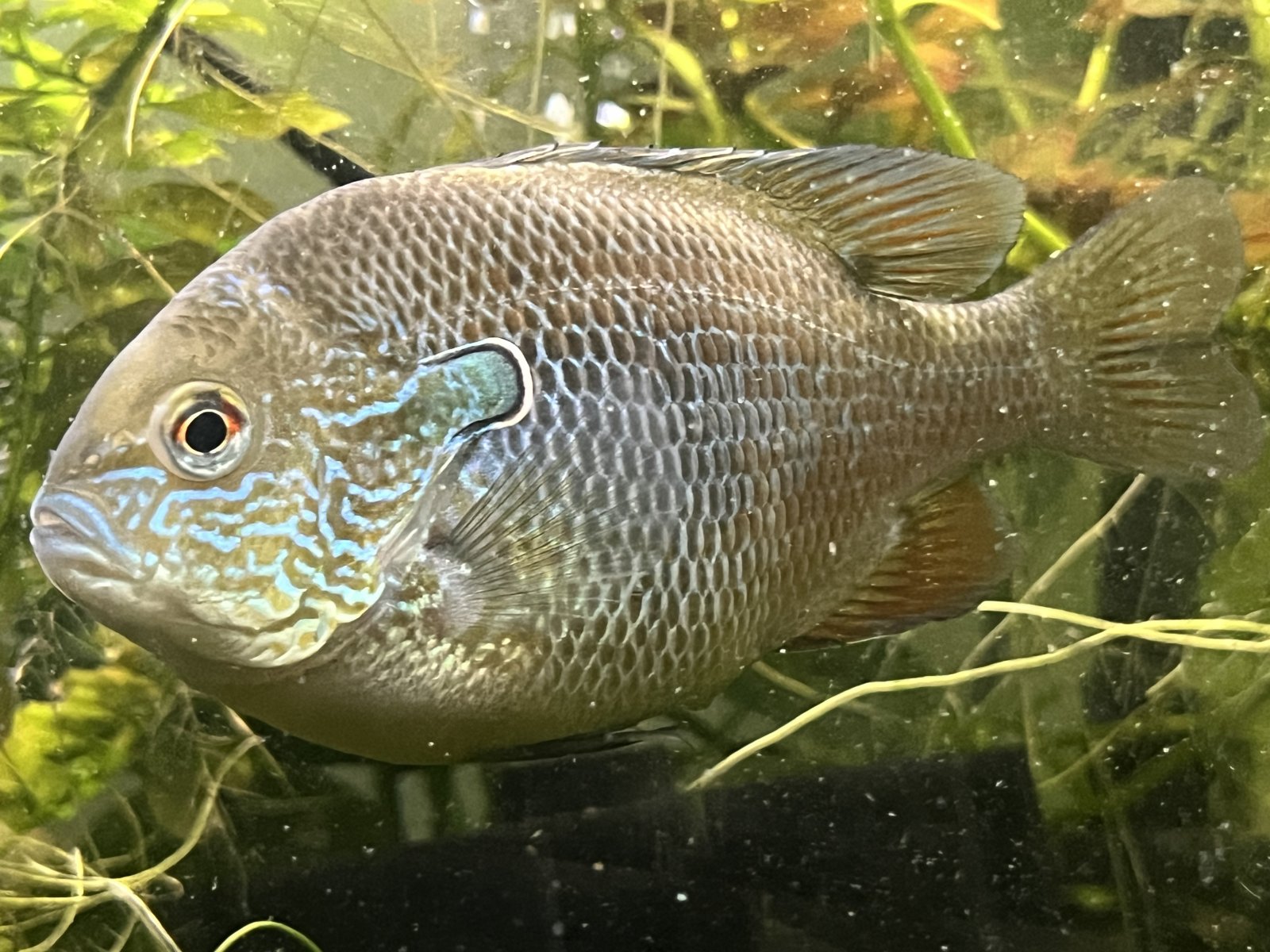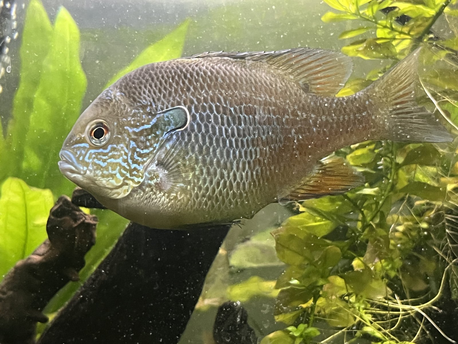 Sunfish are active fish, they might be able to produce a lot of waste, they are not a typical aquarium fish, you might not be feeding it much but maybe he is eating some of the vegetation, snails. He doesn't look hungry and in total mass of food 3 worms, depending on the size, could actually be quite a bit of food for a 55 gallon tank.