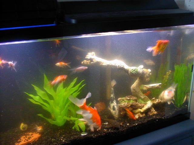 by my understanding the rule of thumb fpr goldies is 20 gal min for one and 10 for each additional. with there being a koi in that tank it is def not big enough. liveaquaria.com says 1000 gal for koi.......they grow to about 3 feet so that alone tells you that the tank should be alteast 15 feet x 15 feet.....just a quess not quite sure. if you look carefully there is also a common plec in the tank(its sitting on the bottom near the biggest one.) also you should keep koi and commets with fancies. IMO this tank is def a very bad set up.