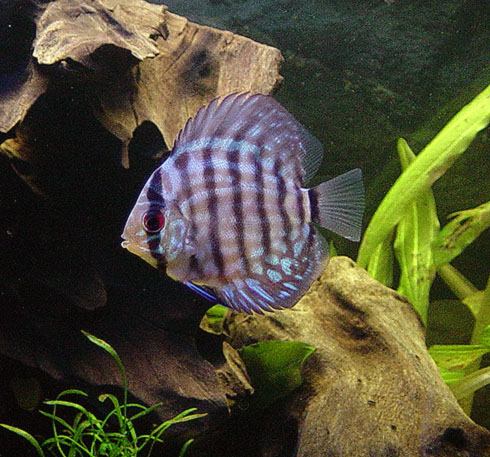 Here's the latest pic of my alpha male Discus, he's about 5 1/2" now and rules the tank with an iron.. er, fin. Here he is in his youth: