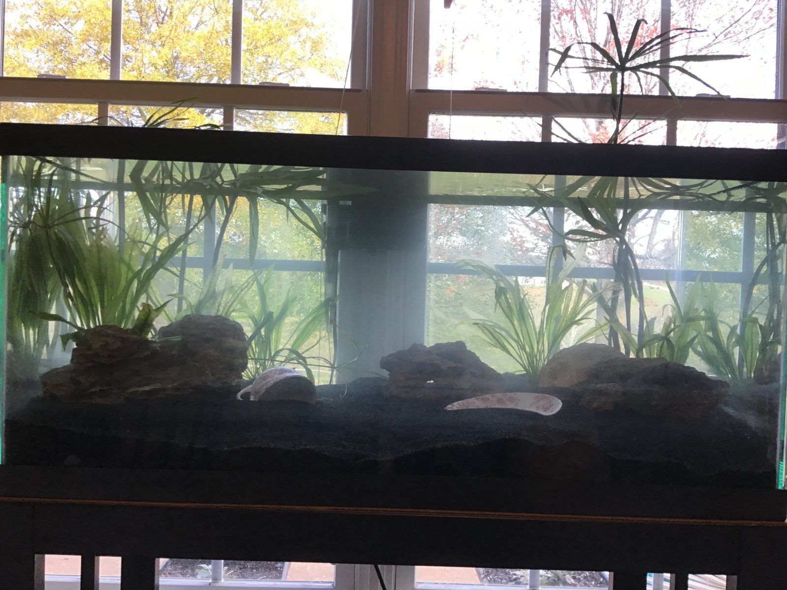 I got the 40 gallon all decorated! Black sand, dragon stone, amazon swords, dwarf sag, and umbrella palms right now. And of course I can’t forget the teacup! The plants need a bit of care and the sand needs touched up but I think it is looking decent. The water is a little cloudy from the sand, and I need to attach my black background.