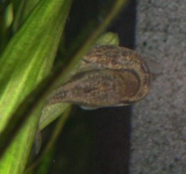 These are the two fish involved. The female is the obviously larger, broader fish measuring well over an inch and the male is about 1 inch long. I first noticed the male closely following the female. At first it looked like the male was trying the graze on the females back but further observation told otherwise!