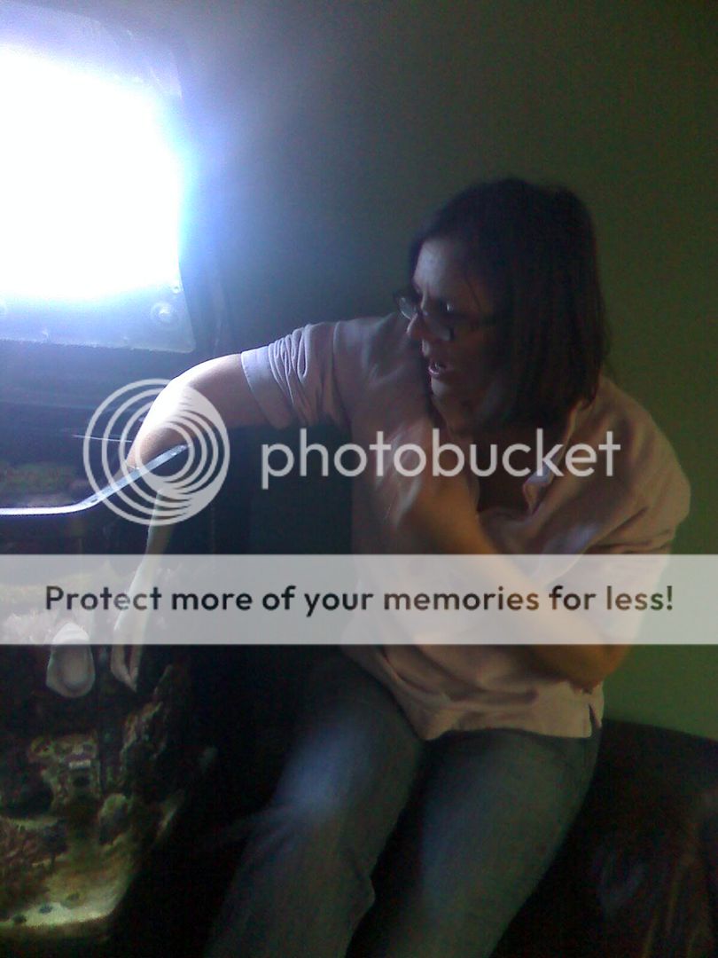 ) – round she comes with Chaeto and what looks like an off cut from a string vest, opens my tank lid and duly wedges the stuff behind my spray bar – not before complaining about the coralline that might be covering one or two of the holes on the spray bar, but hey, she fixed that