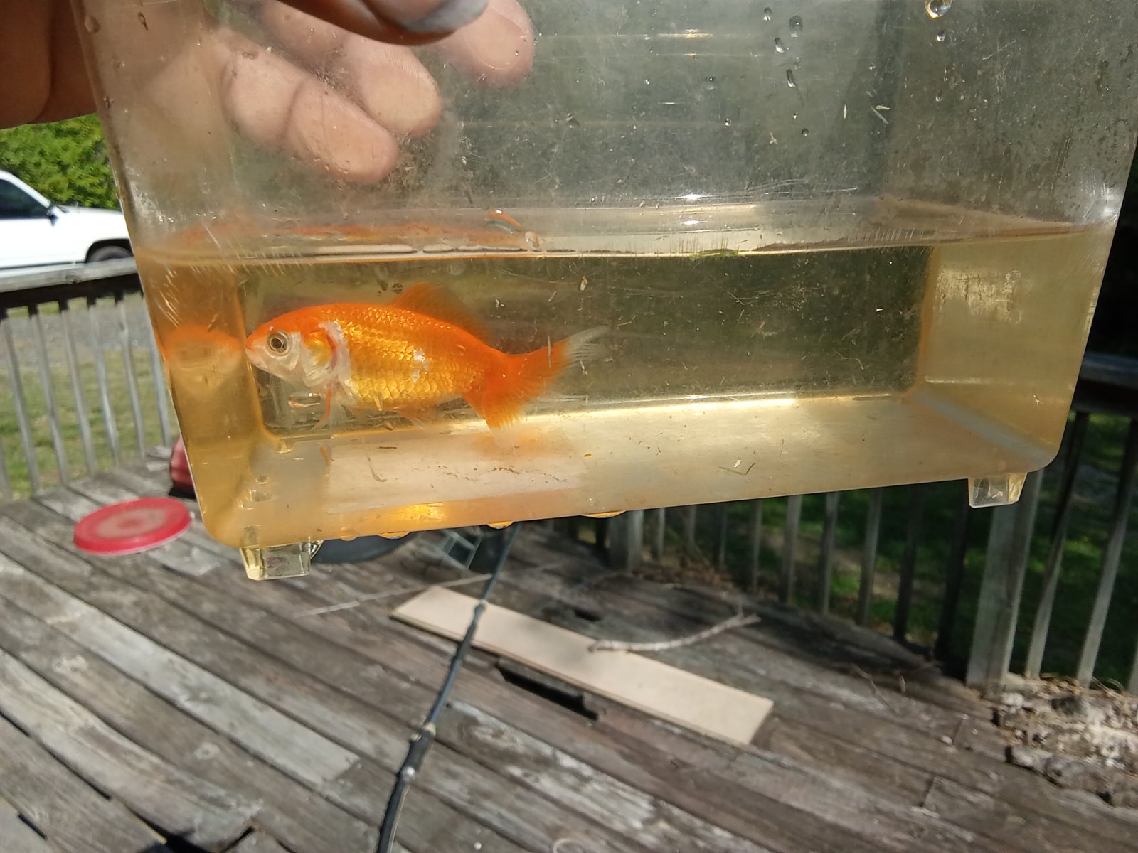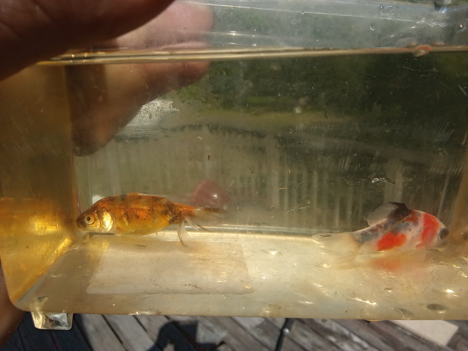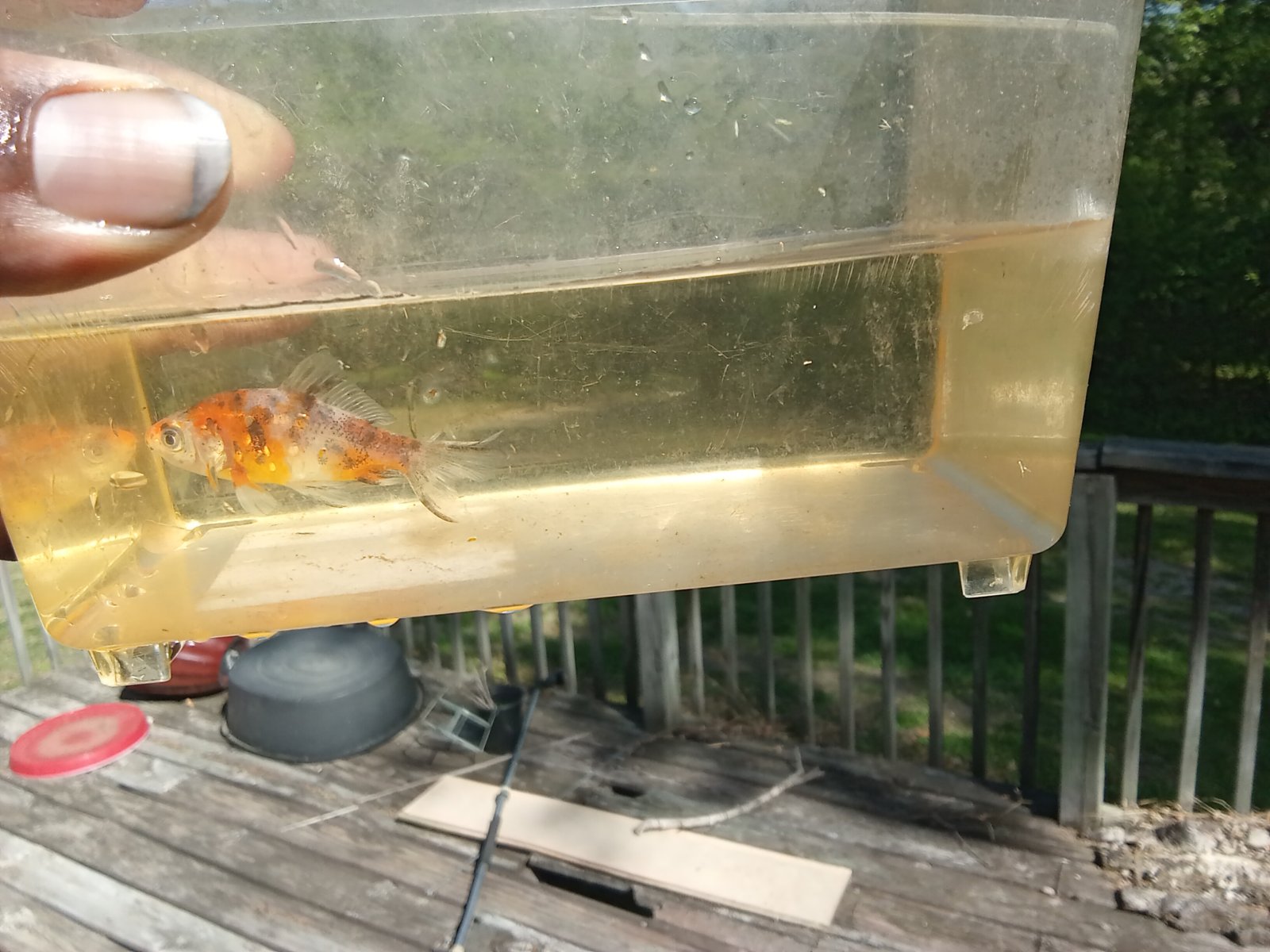 I lost my Sailfin Mollies back in the winter, and didn't have the patience to wait for more. So I went and got two goldfish for my second tub. The brown one's name is Raine. Would someone like to help me with a unisex name for the smaller orange goldie?(And no, I will not name them Goldie!)