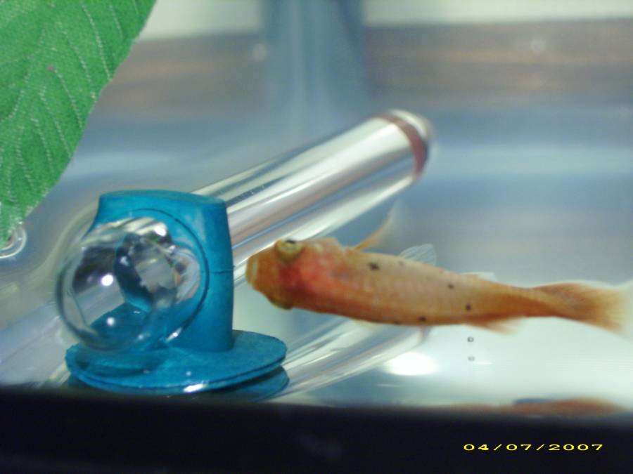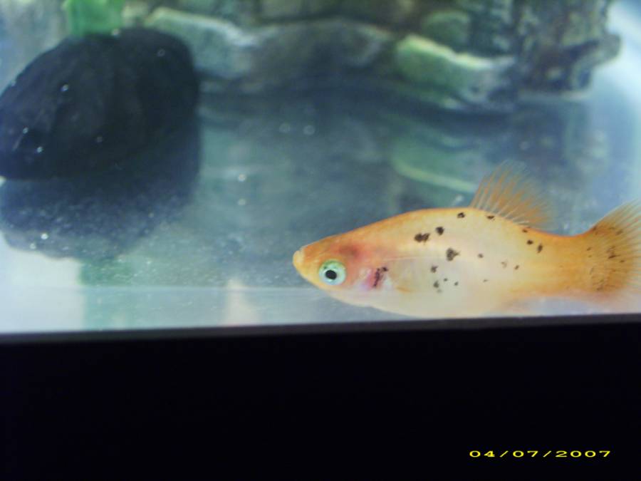 Okay so I got these really neat Red Dalmation Platy's and the one just doesn't seem quite right. I put them in with my community tank for now. The tank has been set up for several months so its cycled but i found my one Red Dalmation Platy to have something wrong with her. It looks like she has internal bleeding in the brain. Its odd, the other two don't look like it at all. She just lays around and doesn't move much. She started like running into walls so I isolated her in a hospital tank for now. Here are the best pictures that I could get of her.