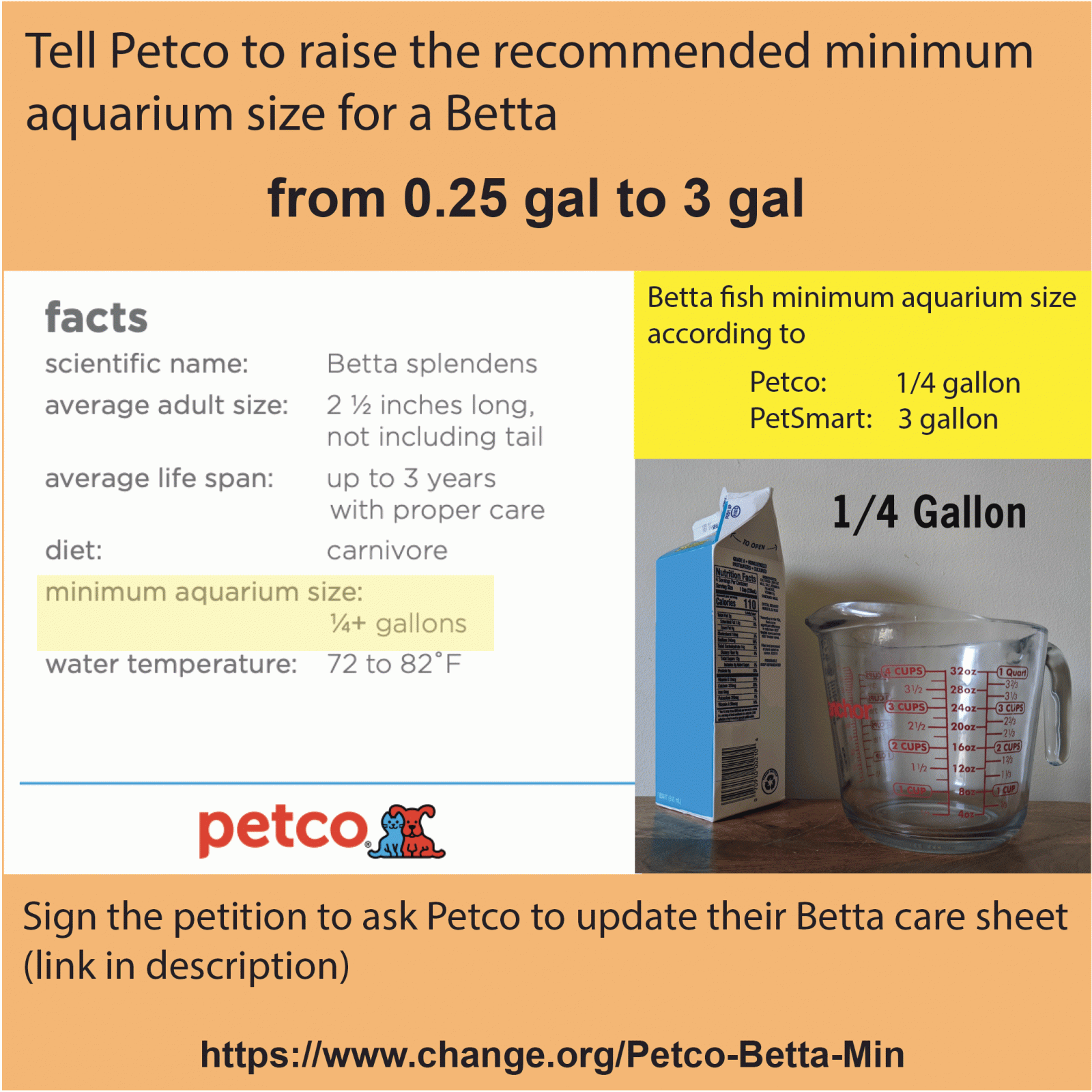 I started a petition for Petco to raise their recommended min aquarium size for Betta fish from 0.25 gal to 3 gal in their Betta Care Sheet. Right now when you grab a Betta care pamphlet in their store or look online, it says min: 1/4 gal!