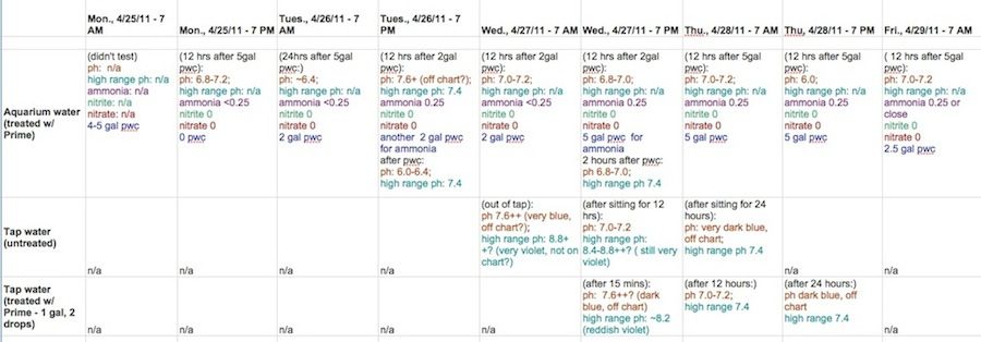 , ph would fluctuates between 6.0-7.8, sometimes hard to tell the differences between the teal colorsThis week I decided to test the water before water changes also. I also tested tap water at 15 min, 12 hour and 24 hour intervals (both treated and untreated).