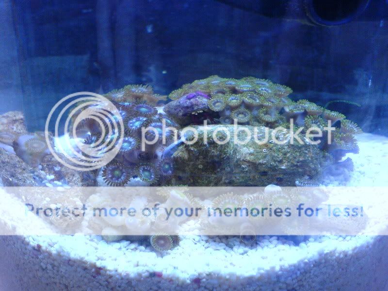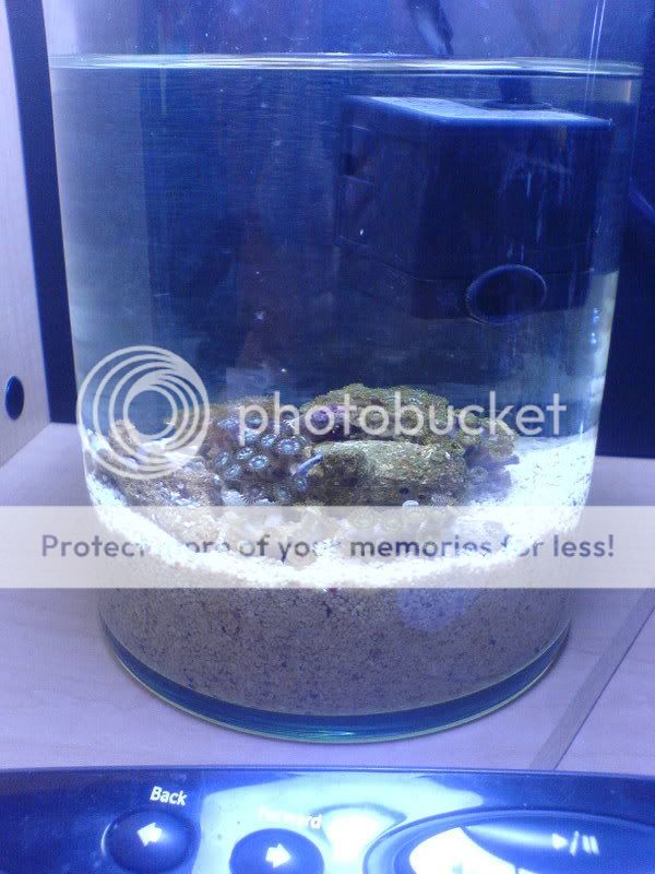 Well, today i decided i was finally going to spend some money to get some coral from the lfs(first sw tank too). I got 2 frags, a 50/50 actinic 10w bulb, and a scarlet hermit for less than 20 bucks. I put it all in the container and filled it with half moon bay water. The temperature is 70 degrees, i know its low, but i couldnt find a heater this small, and this area is starting to get pretty warm. They are starting to open, but unfortunately, i forgot my powerhead at home