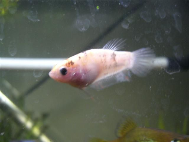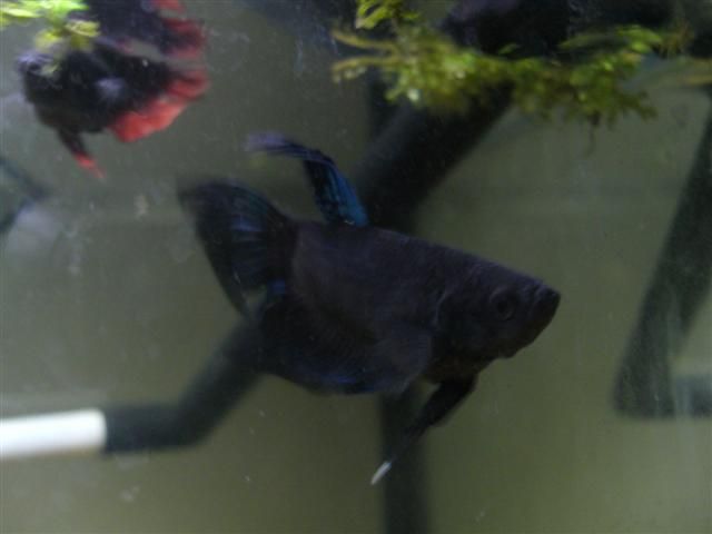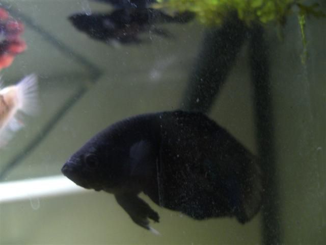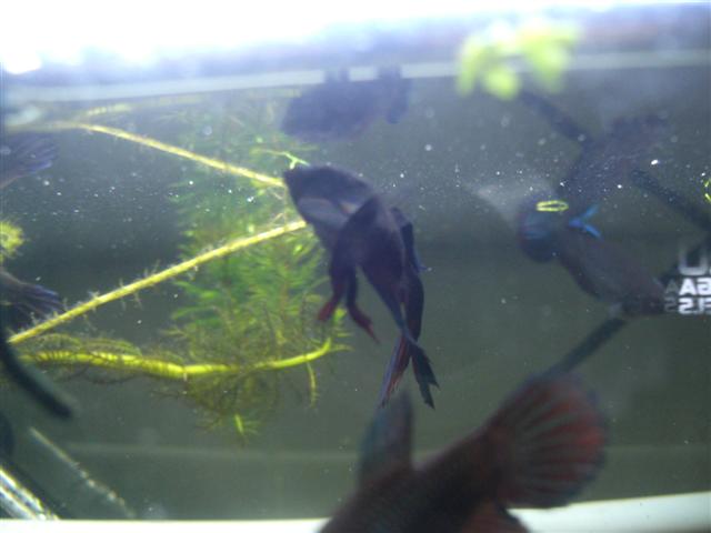 i love this little white girl, she has a tiny bit of marbling to her body and a tiny bit on her anal fin, im thinking il pair her to one of her brothers. you may notice that not only is her brother (the very dark fellow) living alongside her and the rest of the sisters, but he is happily cohabiting with two of his brothers.. they were in containers suspended in the water to seperate them, but the plec knocked them over and they have been living together for several weeks now, without so much as a flare... please note "NOT THE NORM!!" cheack out the more brightly coloured boy, his tail is very long and slender, not like a normal veil... kinda like a flagtail guppy!