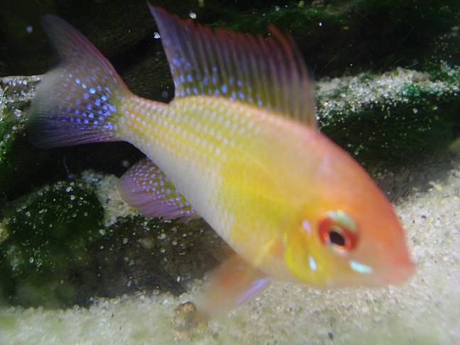 The last month he'd really coloured up with feeding alot of frozen food and live food which he prefers, doesnt really liek flake very much, im finding a nice female for him, they should do well together in a 20 gallon along a few tetras and maybe a pair of honey gourami