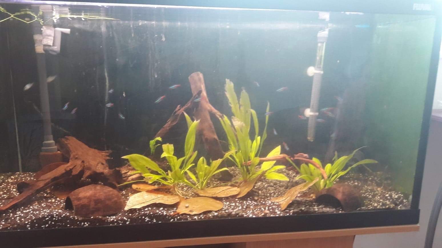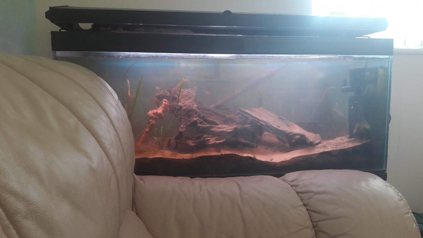 In terms of decor, there are 5, pieces of driftwood, 2 coconut halves, and the leaf litter. Filter is a Fluval 305 canister.