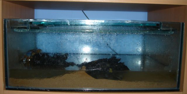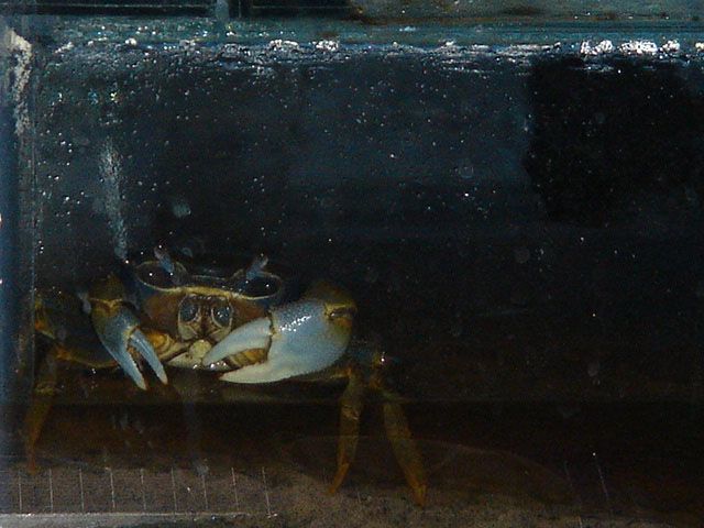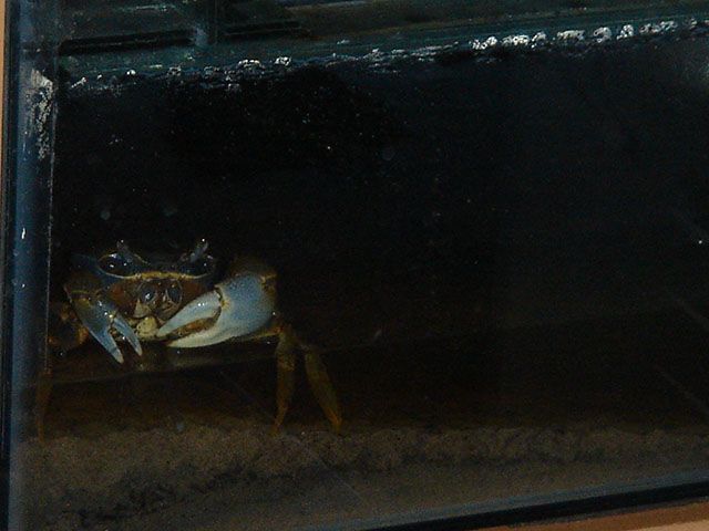 A few pictures of my rainbow crab, hes kept in standard fresh water, a heat mat used to maintain a temperature of 22*c, sand is used as substrate, and bogwood so he can easily get out of the water and he can eat food more easily above the surface on the bogwood. He eats pretty much anything you give him, grapes, cucumber, flakes, frozen and live food.