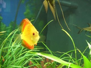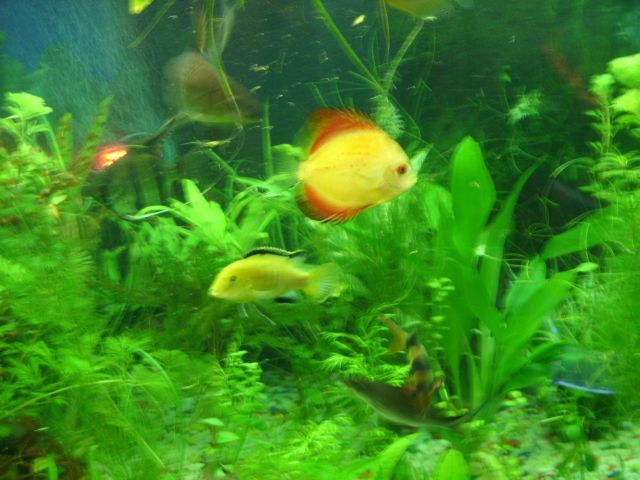 I am going to be honest with you, it seems you have some compatibility issues. Discus can be quite finicky, and need to be kept in groups. Big fast moving fish (like Balas) will mostly out compete the Discus for foods (which Discus need a lot of in order to grow.) They can get latched onto by the CAEs (although that's been said) and they need large water changes done at least twice a week. Also, that Discus can't be 5 inchesLooks around 3 or 3.5, probably still a juvenile. It has good color though and good shape, so take good care of it!