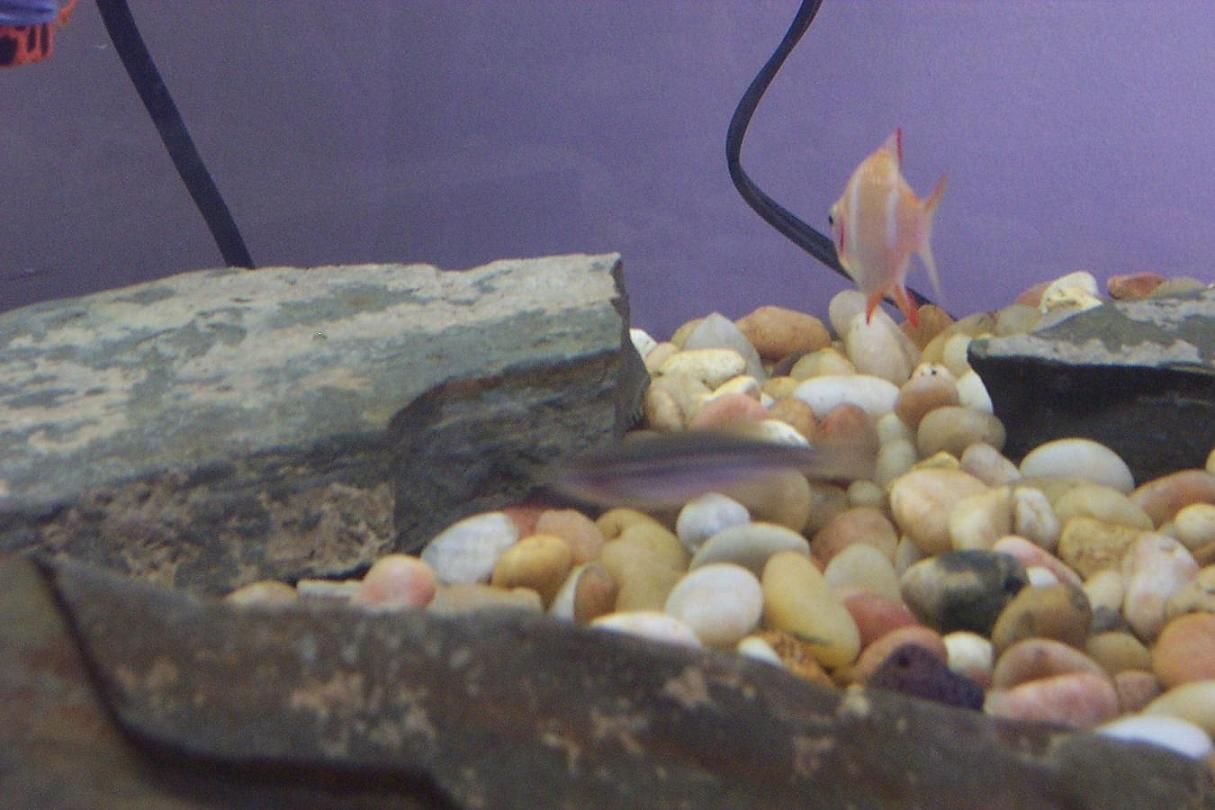 there is a danio in the middle, sorry he's blurry, but they never sit still!! my albino tiger barb is in the back ground.