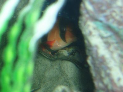 Clown Loach peeking and the Puffer This photo is very recent. The Royal King Pleco, the Clown Loach, and the Skunk Loach, who very rarely is seen.