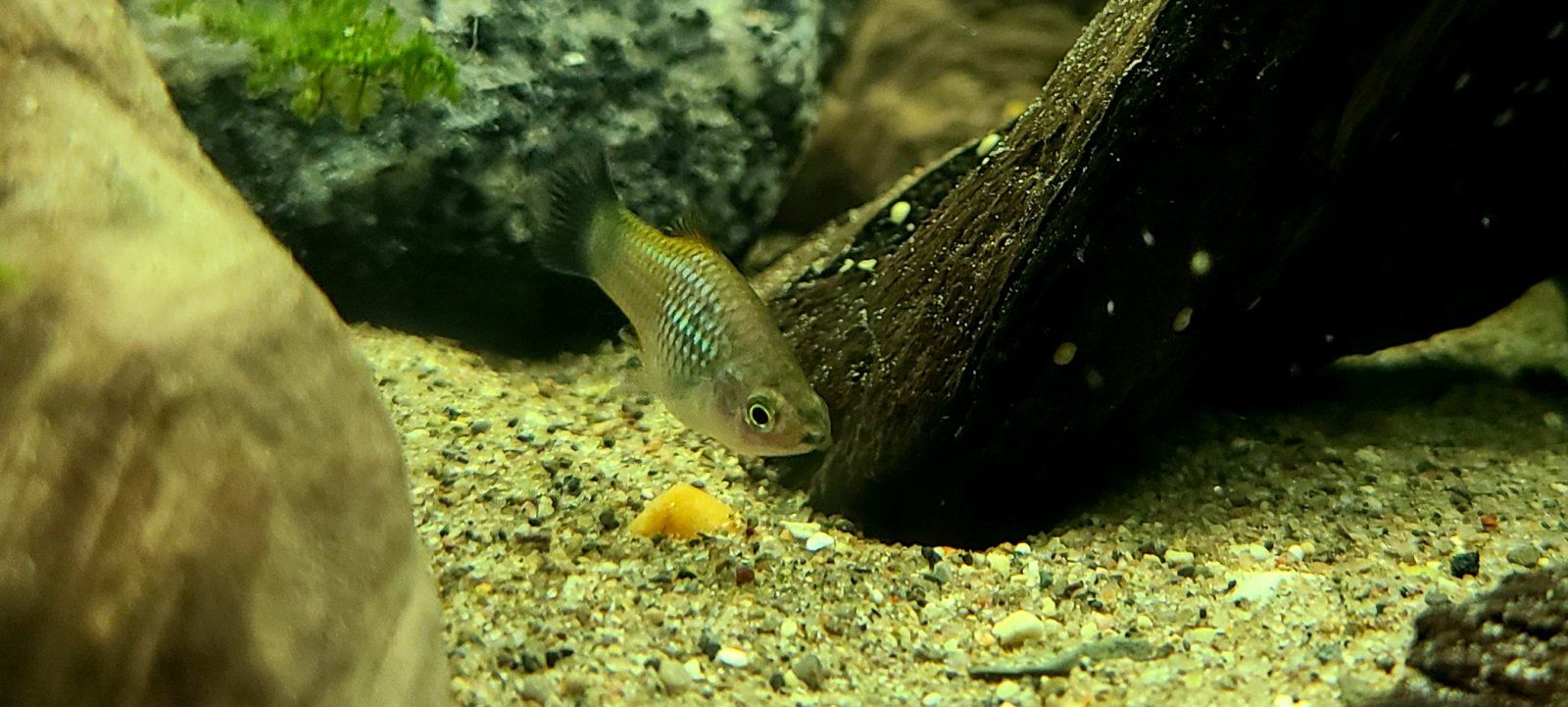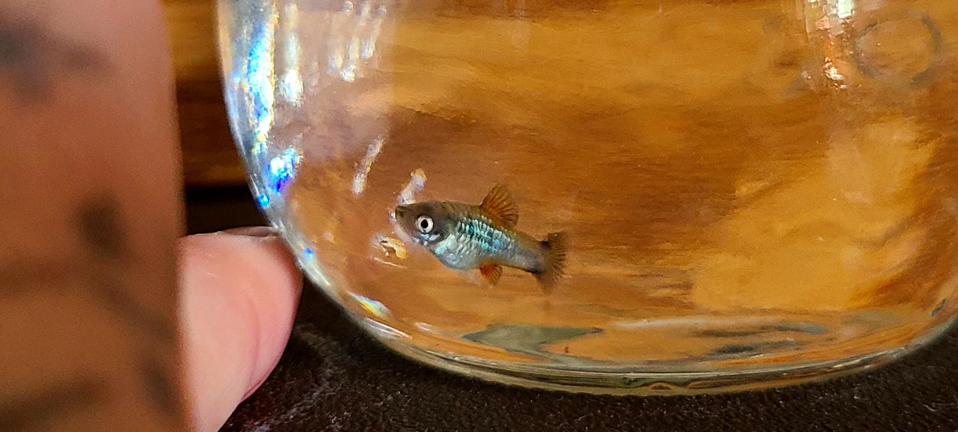 Hes been moved to my 55, where he will be okay, though small and skittish there. But he should be large enough now to avoid being a snack. I don't know the gender yet however.