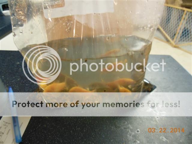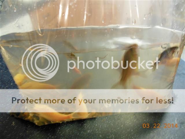 There are 6 yellow corys, 4 bronze (I mean this in color, NOT as in the type) corys, 3 something, possibly danios?, and one pink / orange one. One of the danio types looks like it may be pregnant, or may be ill.