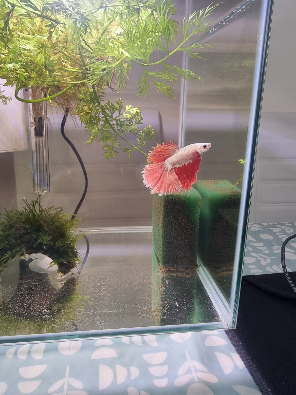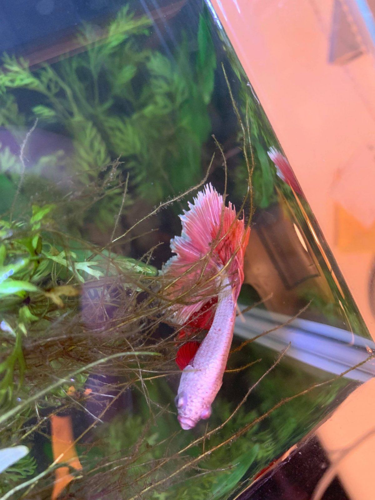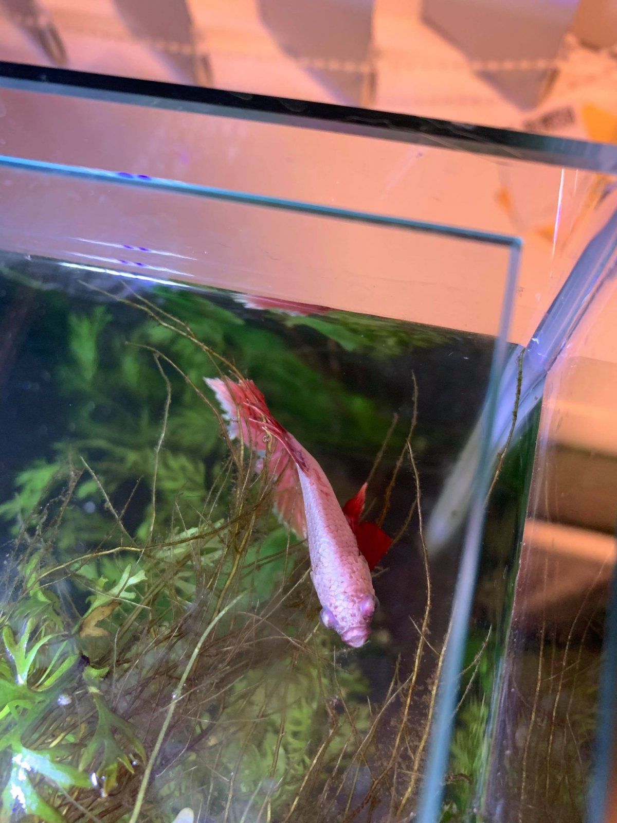 My Betta, who is in a 240 litre community tank isn't well and I'm not sure how to help him. He was introduced to the tank on 13th July after a very traumatic journey through the post and seemed to settle in well, he was feeding and swimming around the tank quite happily. I introduced some water sprite a couple of weeks ago to help him feel more comfortable. I noticed on Tuesday that he appeared to have some scales missing just below his dorsal fin. He has been swimming in and out of the rocks that I have in the tank and I also noticed that he had swum into the large wood that I have. I've been keeping an eye on him but this morning he doesn't look good, his fins are clamped and he's just sitting underneath the water sprite, as per the second picture. My water stats are good, I did a water test this morning and no ammonia or nitrite, nitrate 5, GH 13 and KH8.