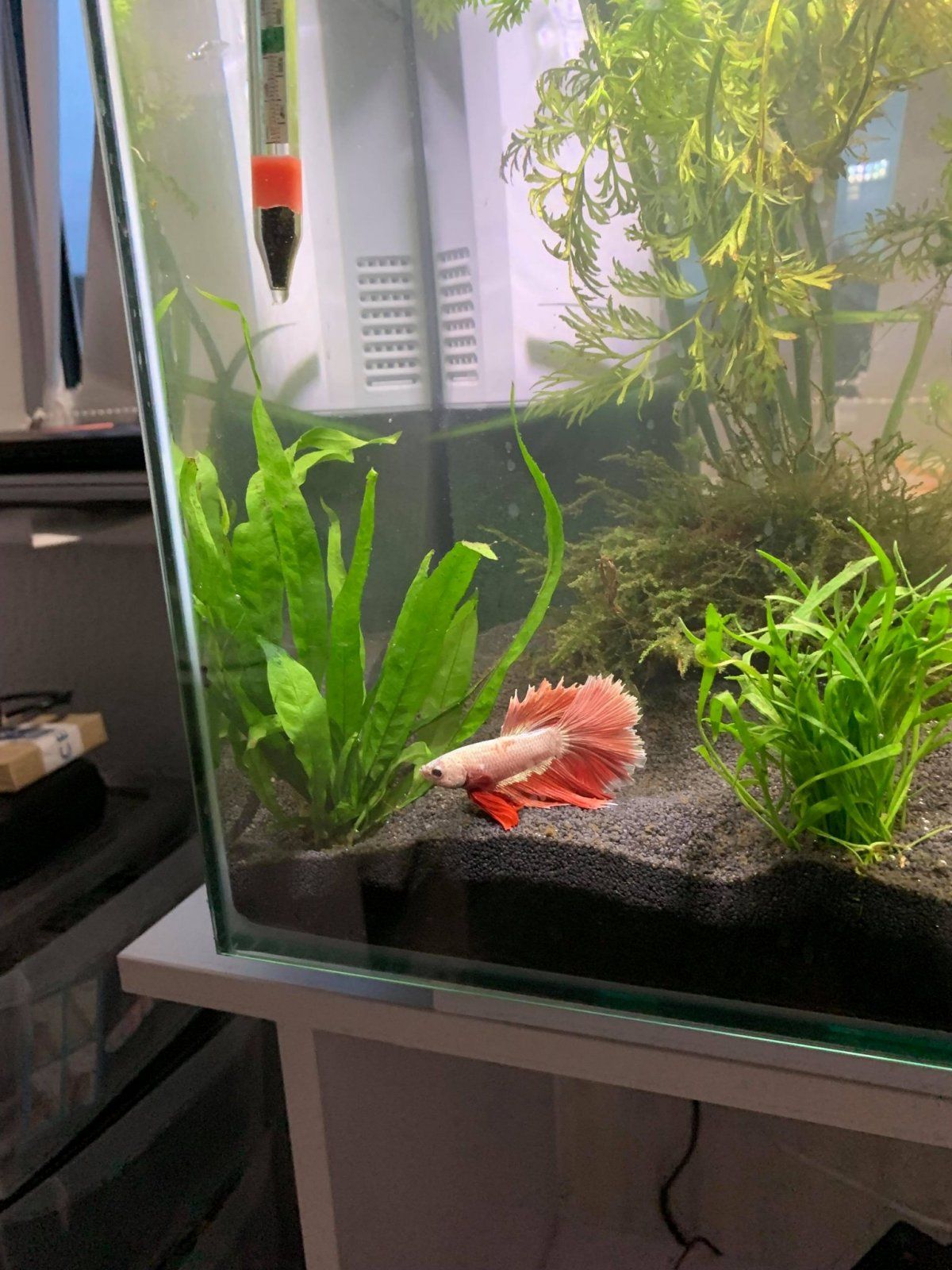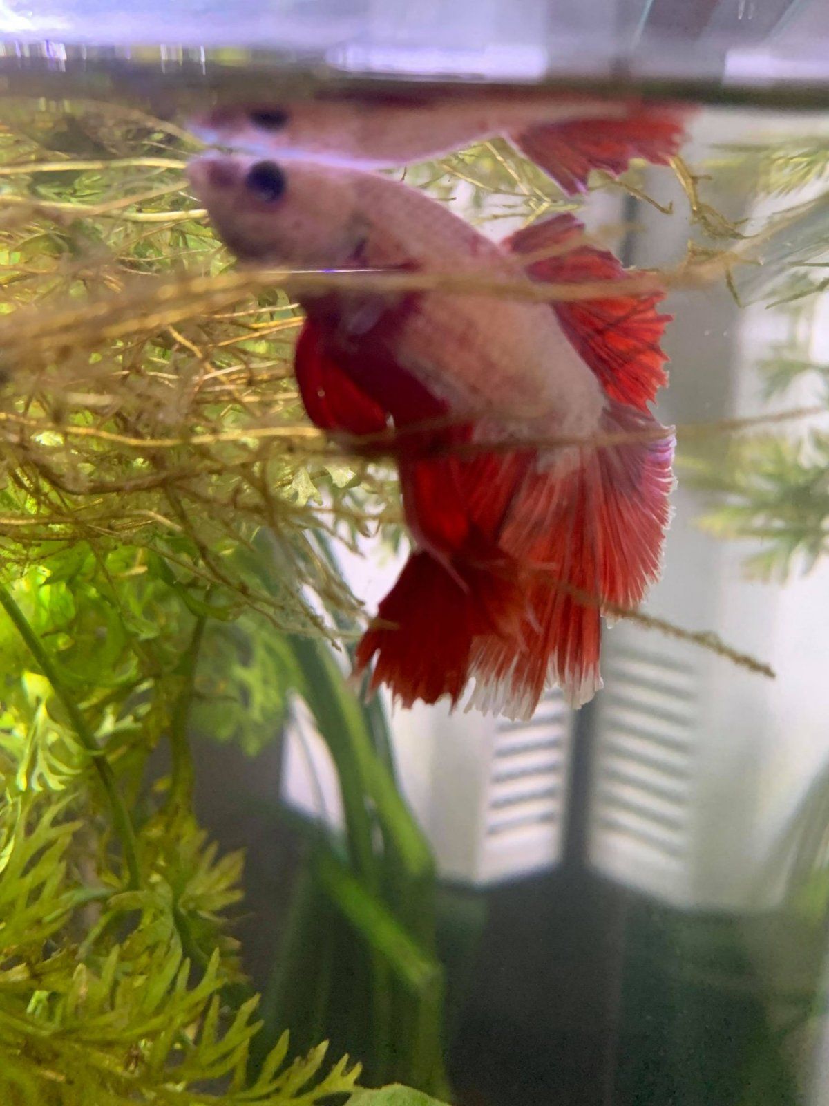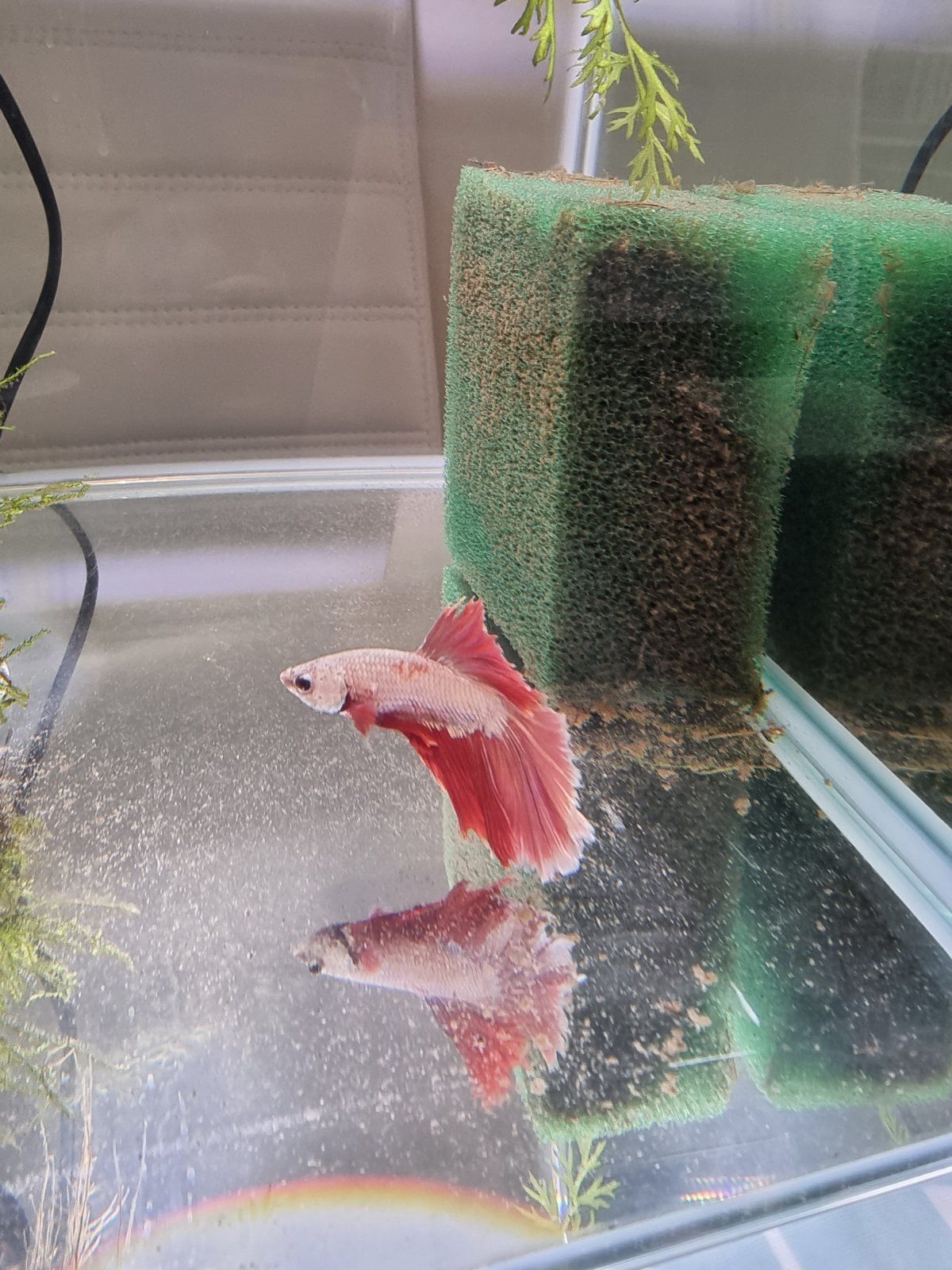 My Betta, who is in a 240 litre community tank isn't well and I'm not sure how to help him. He was introduced to the tank on 13th July after a very traumatic journey through the post and seemed to settle in well, he was feeding and swimming around the tank quite happily. I introduced some water sprite a couple of weeks ago to help him feel more comfortable. I noticed on Tuesday that he appeared to have some scales missing just below his dorsal fin. He has been swimming in and out of the rocks that I have in the tank and I also noticed that he had swum into the large wood that I have. I've been keeping an eye on him but this morning he doesn't look good, his fins are clamped and he's just sitting underneath the water sprite, as per the second picture. My water stats are good, I did a water test this morning and no ammonia or nitrite, nitrate 5, GH 13 and KH8.