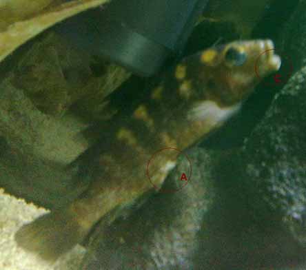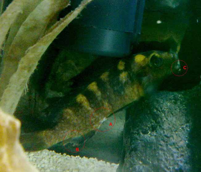 She's usually very dark in colour, has a very sunken belly, which I'm thinking is an Internal bacteria problem, but she also has a drooping bottom lip that seems to be always open, that has now developed a white lump on it, she swims upside down on her side and somtimes just lays there looking dead.. Also there seems to be a nasty looking white patch by there bottom fin She also usually hangs out near the top of the tank..