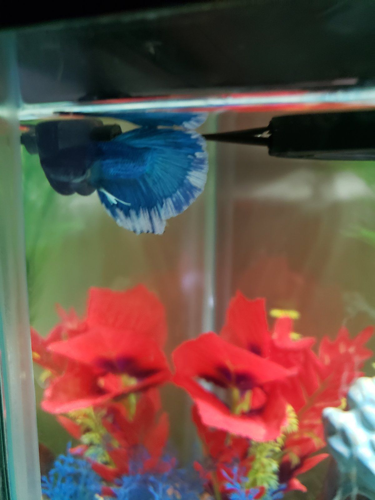 I only have one picture of the whole tank and two of the fish with me. I'm actually away because of a medical emergency right now so I can't take any more at the moment. (I had to come to my parent's place 30 miles away because I needed the ER and am established with the one there. I don't know how soon I'll get back. I expect my parents to go tomorrow to get my car and feed the little guy for me.. will ask them for better photos of the fish. And I'll try and get Mom to go back on Tuesday to feed him. It's POSSIBLE I could get my landlord to pop in and feed him, but not sure. ) Gospel's maybe an inch in size? I think as he gains strength just by being able to swim around more he won't have quite the trouble as he is now. Even one day after making this thread he got away more easily. The same filter with the exact same set-up in my 5.5 is absolutely fine... but the betta was already strong from being in the wrong kind of tank for many months (vertical instead of horizontal. I remedied that as soon as I could) and is also about twice the size of the new guy with different tail type. I think size, strength, and tail are the cumulative culprits.