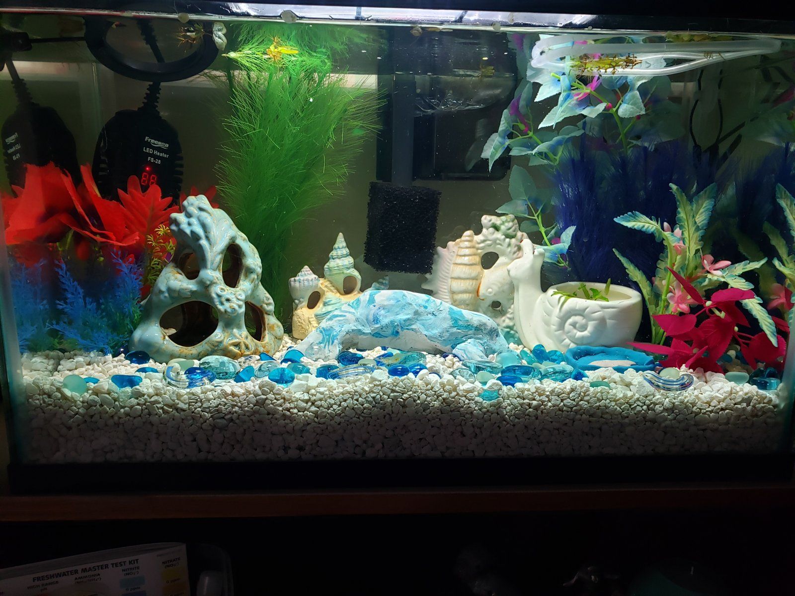 The tank is DEFINITELY cycled. I wouldn't put anything in an uncycled tank. Did it twice... once in college and once sadly not that long ago and it worked out... but never ever again. It has a lid that came with it (I bought it used and did a massive clean up of it this summer... very thorough and careful. It's completely safe). The lid had a precut section for the filter in the center of the tank. So I had to plan all my decor around that. I have lots of silk plants (and one silicone). Some ceramic pieces made for aquariums, one with spaces large enough for him to swim through or hide in should he desire. I originally had African dwarf frogs in there (just stopped eating one day. Tried for two weeks to entice them but finally took them back and went back to my betta love). I created a feeding dish out of polymer clay and a large manatee out of polymer clay that they could hide under. Both were fully cooked. I have one potted plant in a ceramic snail pot. It's still a baby... it's a crypto. Don't remember which I went with right off. All the leaves died when I put it in but came back strong as cryptos often do and it is slowly growing and healthy. It's bigger than when the picture was taken, almost doubled in size. Still tiny, but growing.