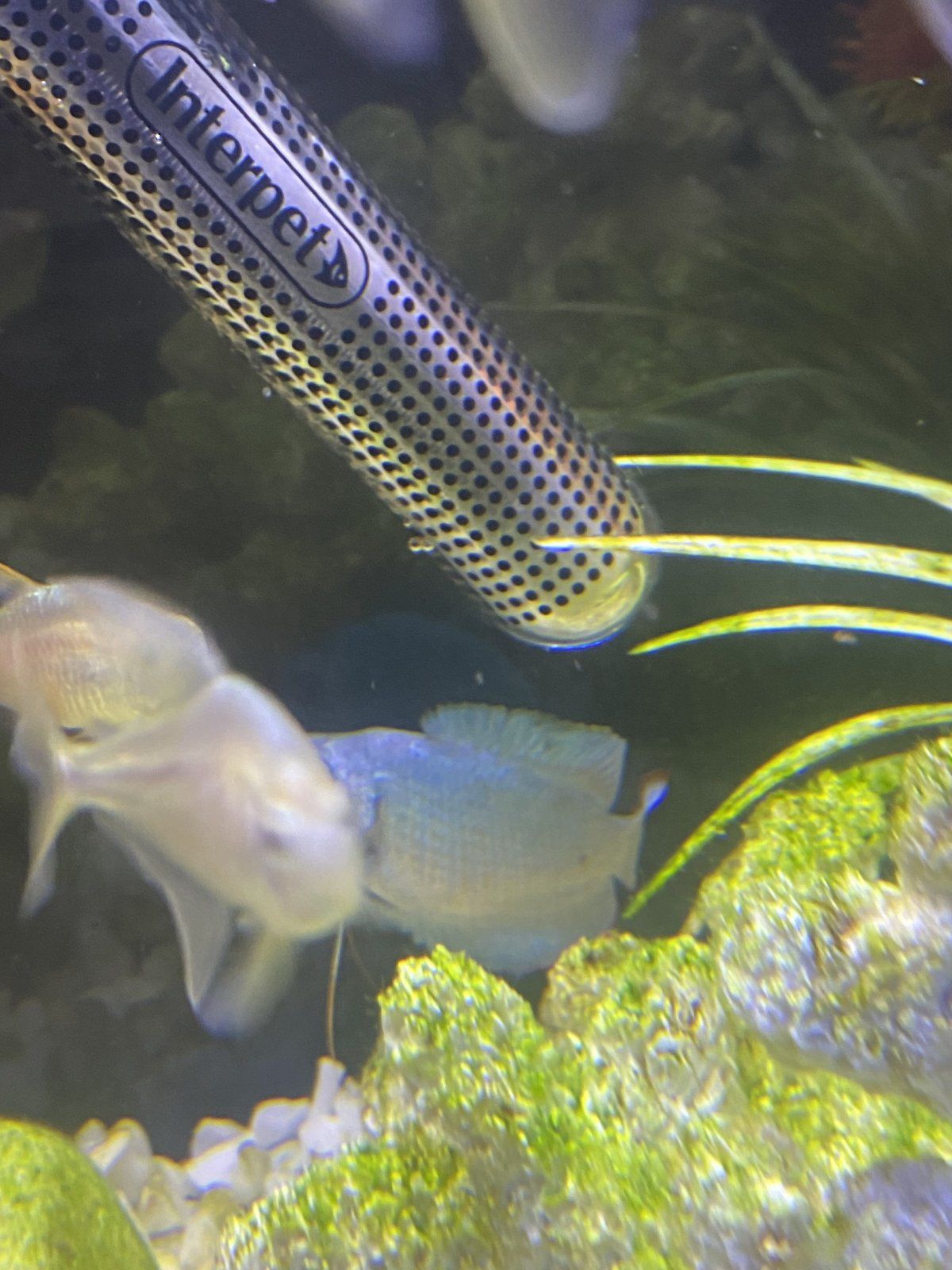 Cichlids can cross breed. Who is in there with her and is he shaking his tail near the eggs? She is certainly a cichlid