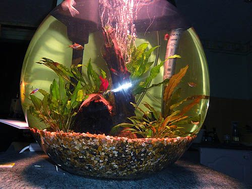In the bowl I have 6 neons, 4 harlequins, 4 rummy nosed tetras, 1 siamese figher, 1 golden gourami, 1 kissing gourami and a bristle-nosed catfish.