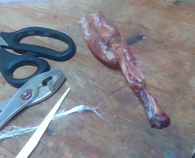 WowI'm home with covid currently, as I said elsewhere. I'm pretty worn out, but not flat on my back, so I'm trying to get some little things done. Today I'm taking some time to process some bison leg tendons into sinew, which I will use to back bows, attach arrow feathers, and a few other things. I love learning new skills, and this is a new one for me. I got some discarded legs from our local bison ranch last fall, and cut the tendons out of them. After drying them out, they look like this:
