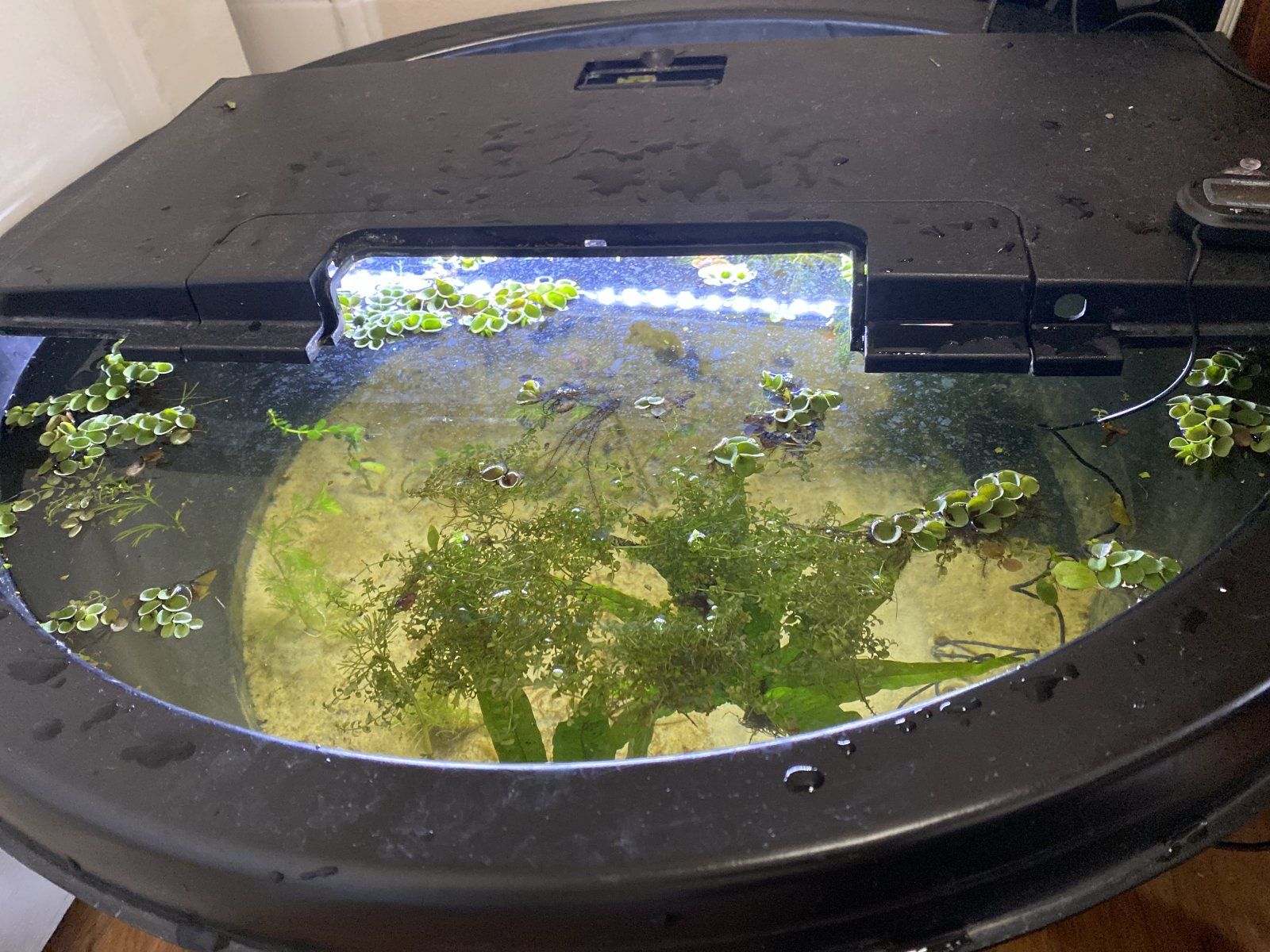 I just spotted it and got a good look. It is a clown killi fry!I swear I just saw something small swimming in my 20g plant growing indoor pond.