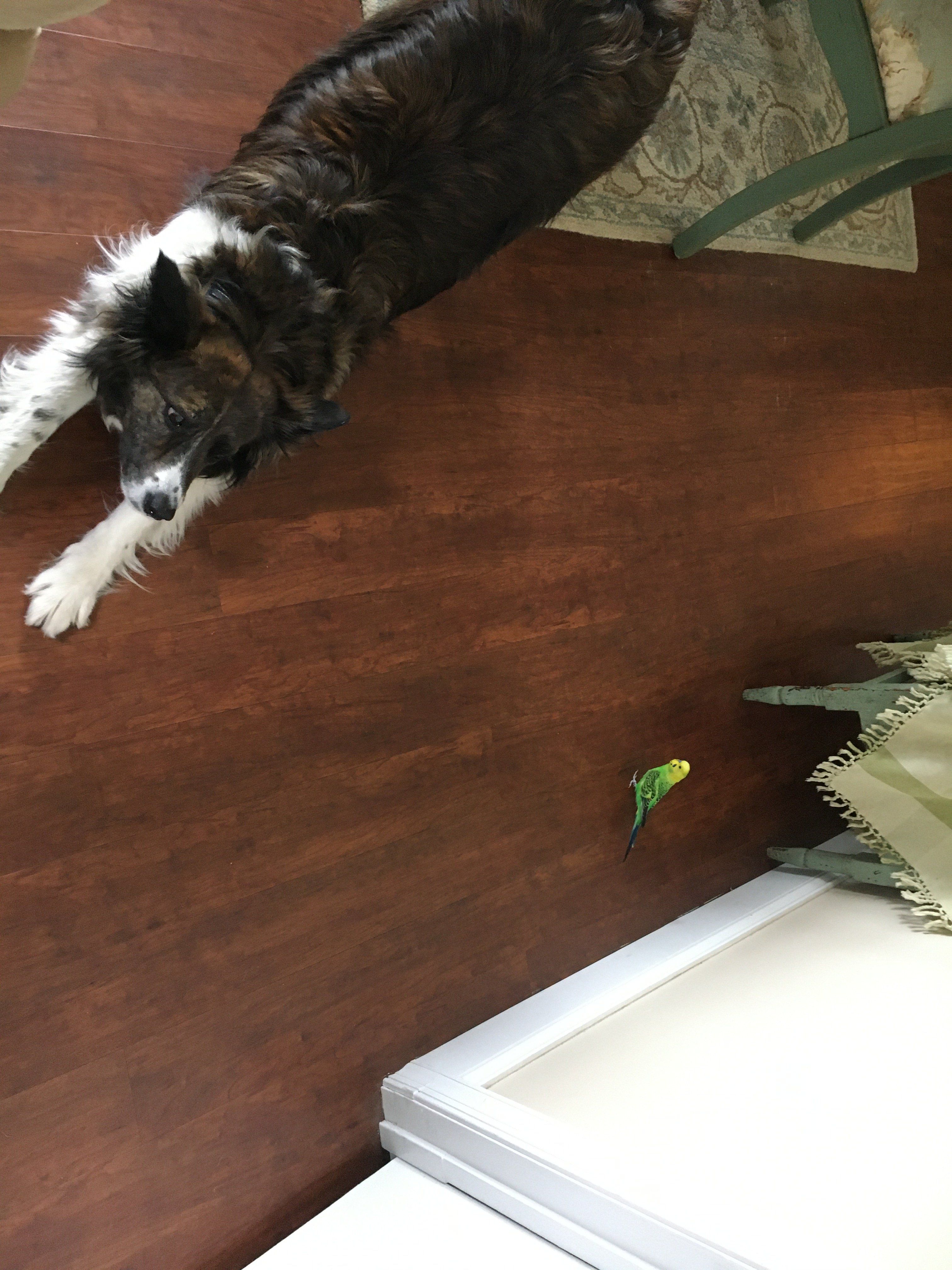 My budger would try and land on one of my dogs, it would spoke him but he didn't mind when she walked up to him while he was laying down. My last one we had our lab was young and he would jump in the air and try and catch him but would just sniff when my budger was on my should. I had some pictures of my budger on my finger and the dog sniffing him.Sofia![]()