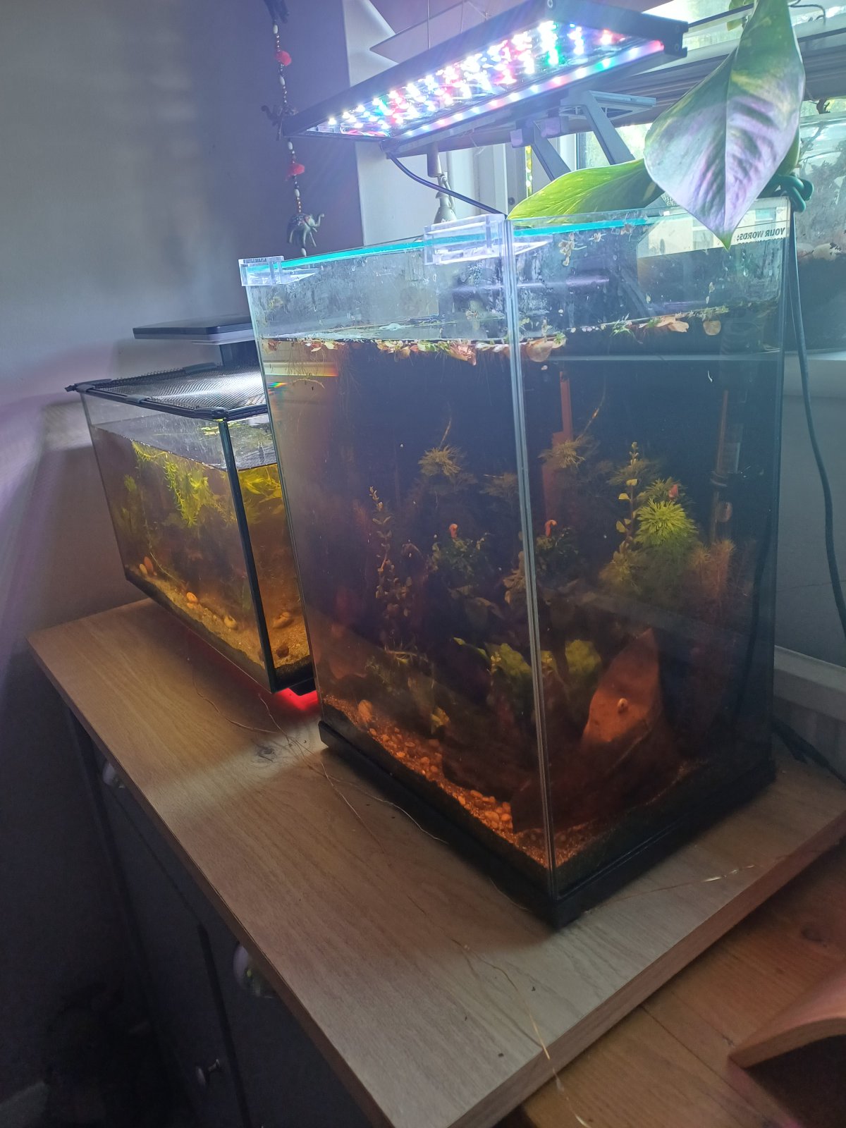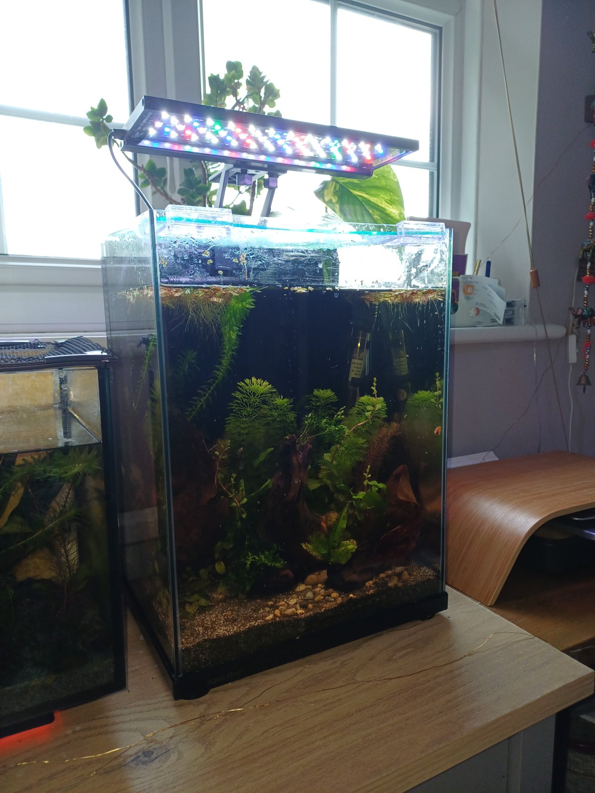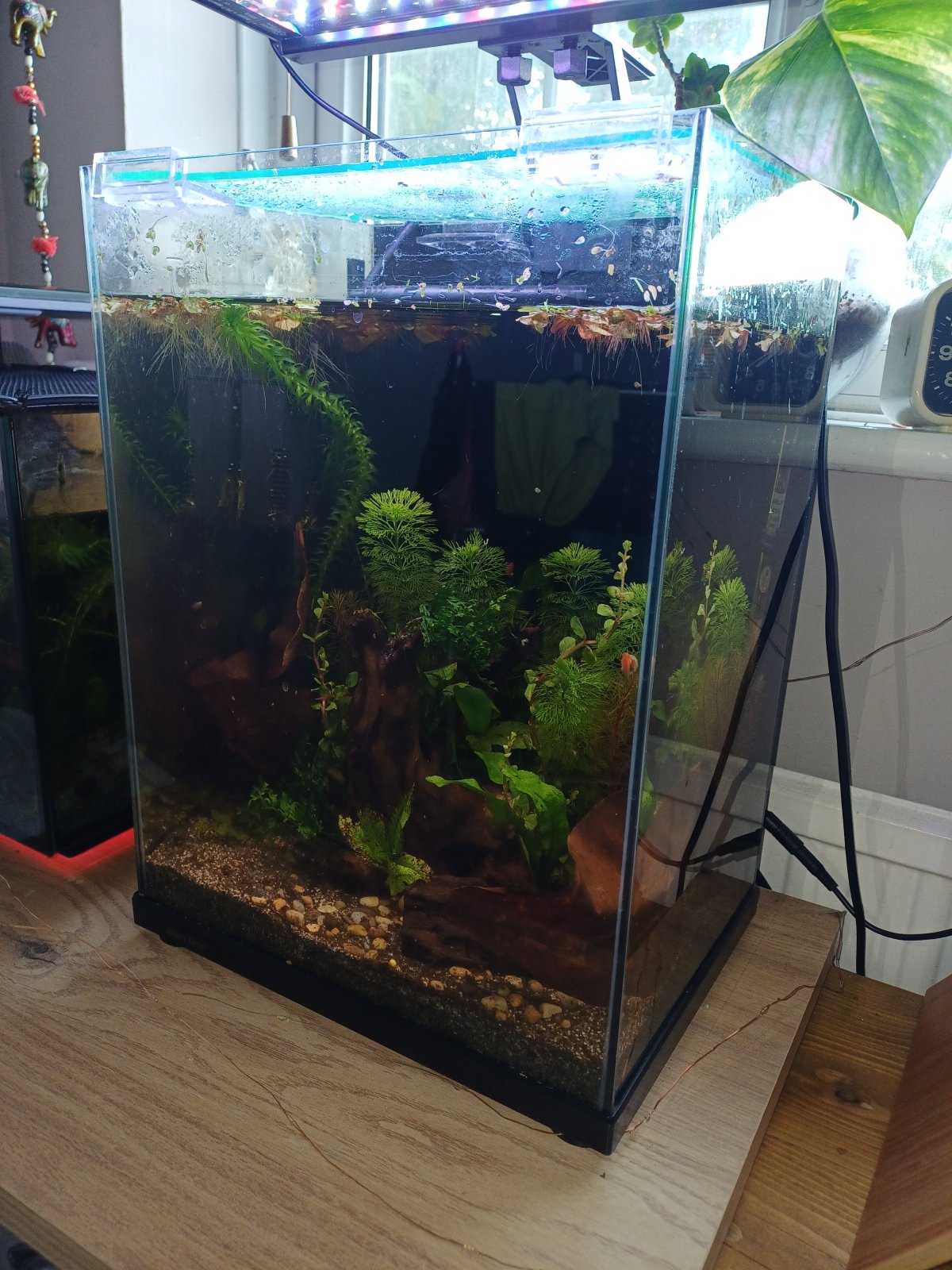 This is the neighbouring tank which houses my ADF's. I really struggle with algae on one specific plant, the one on the left of the image. I can't remember the name of the plant but there's another one at the back of the tank which has the same issue but even worse. The leaves are always breaking so they just don't seem to be thriving. I'm hoping that if I can grow some of the plants in the 6g out I'll replant the stems in the place of these.