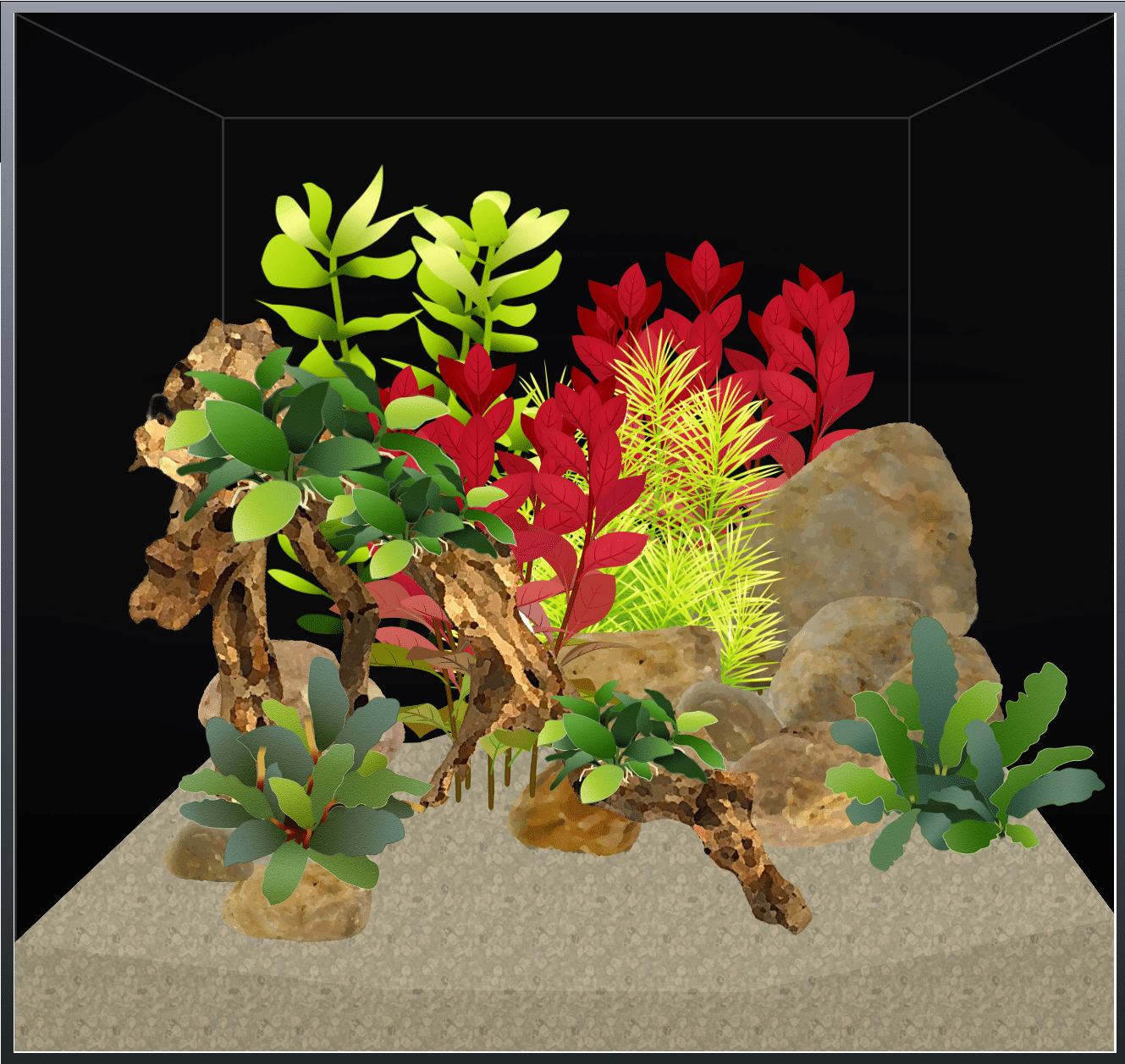 See picture of what it looks like now- I'm willing to pretty much do anything with it, but I think I can keep some of what's in there- maybe move a couple of the anubias to the branch that I have...maybe do something with the pile of moss in the front, etc. but open to anything, really.