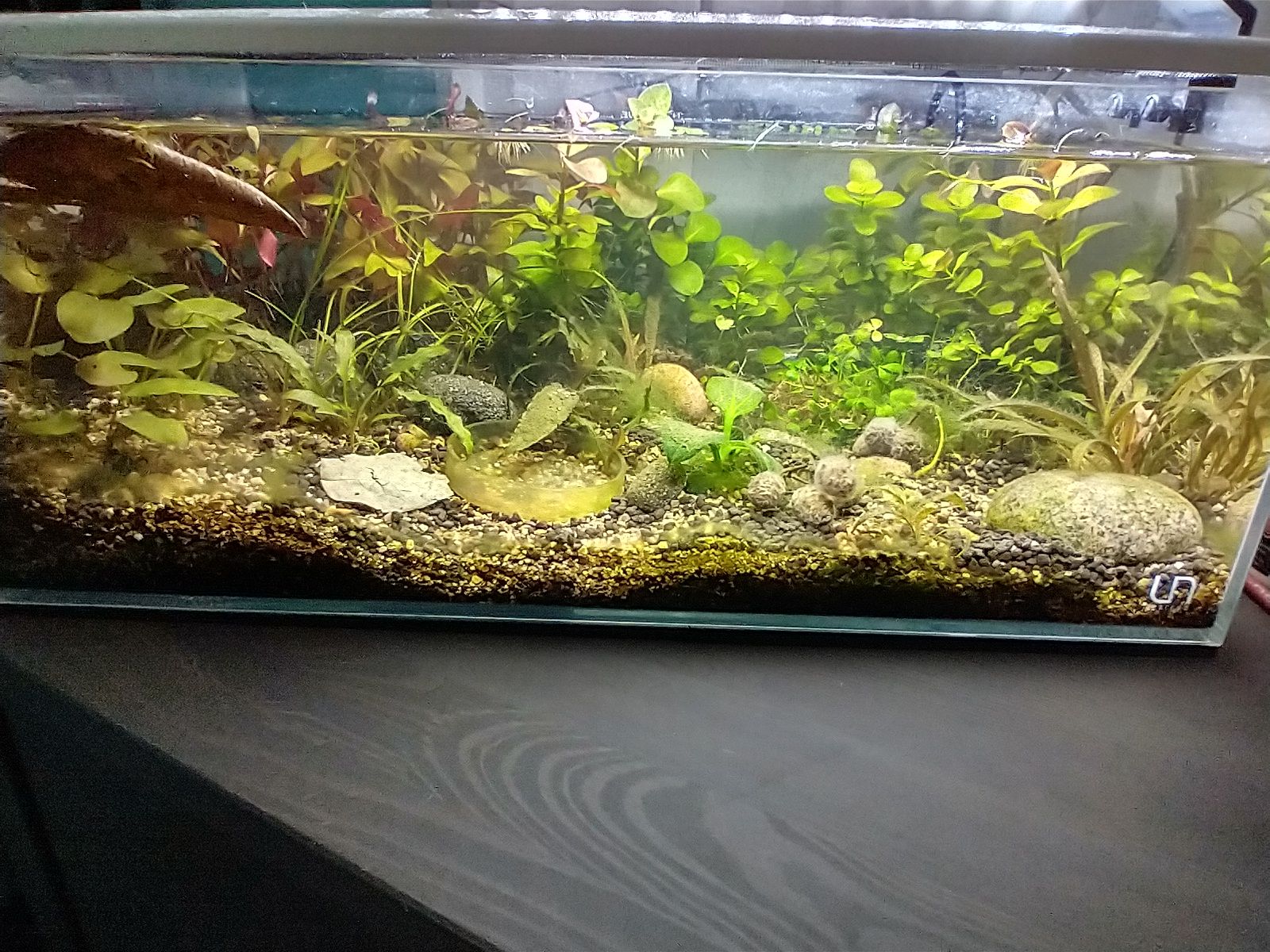 Well as the title says I am setting up a small nano shrimp tank using a rimless UNS tank, some (mostly) ADA soil, a variety of crypts (some tissue cultured C. nurii, another tissue cultured crypt I forget the name (I remembered its C. tonkinensis), and C. tiger spiralis), a small echinodorus iguazu 2009, some stem plants (marsilea, ludwigia ovalis and alternanthera reineckii. Also used some susswasertang tied to small tumbled lava rocks as well as a Malaysian DW with a small beach rock path under it.