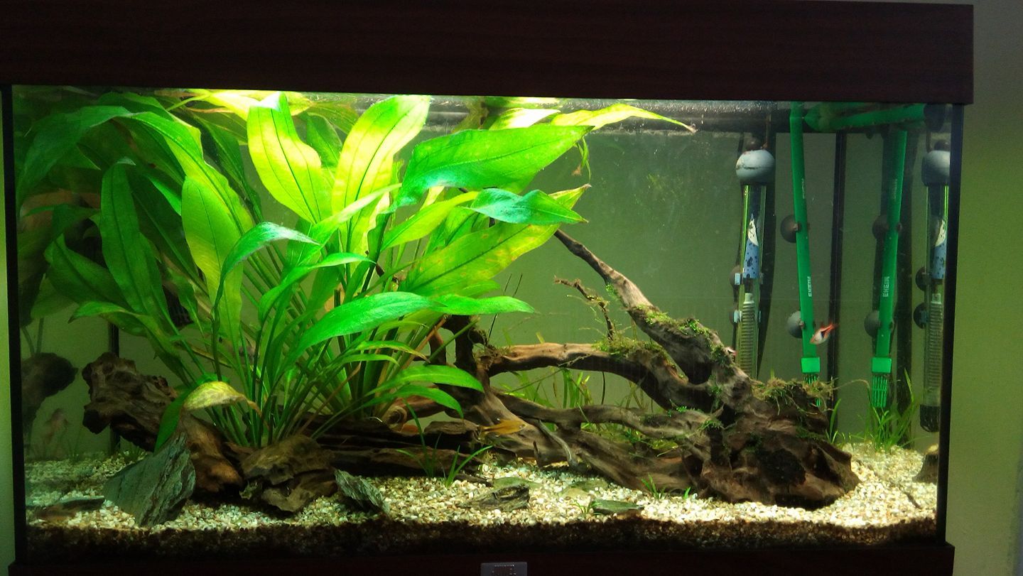 In Good condition, with heater, Aquis 750 canister filter, 2 internal filters (for flow), ornaments, live plants, a few fish. 10ish fish inc tetras, + 1 gibby.